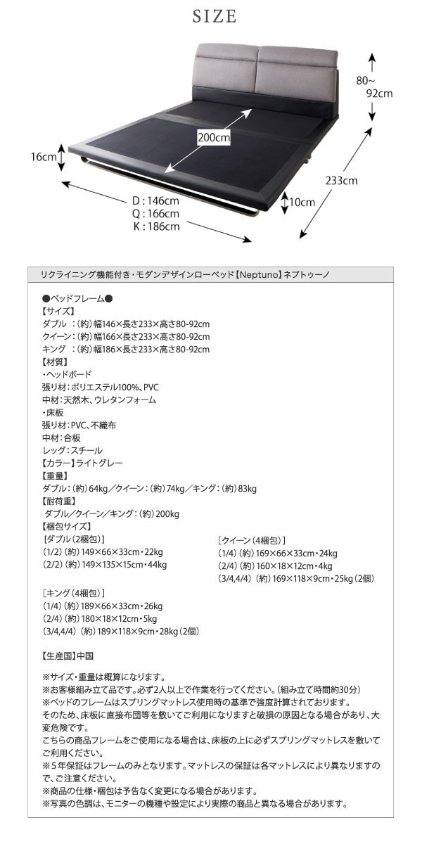 • 品名 モダンレザーローベッド Neptuno【ネプトゥーノ】ベッドフレームのみ クイーン