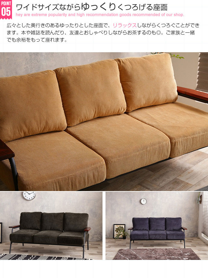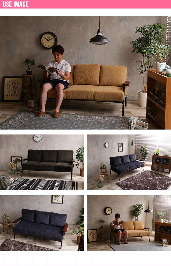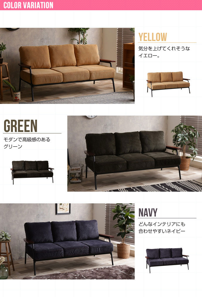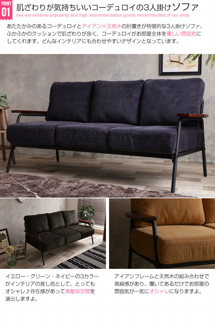 コーデュロイとブラックスチールのフレームと天然木の肘置きを組み合わせた優しい雰囲気の『Basquiat corduroy』3人掛けソファ。暖かみのあるコーデュロイが特徴的で、どんなインテリアにも合わせやすいデザインとなっております。カラーは、イエローとグリーンとネイビーの3色をご用意。お部屋に合わせてお選びください。。