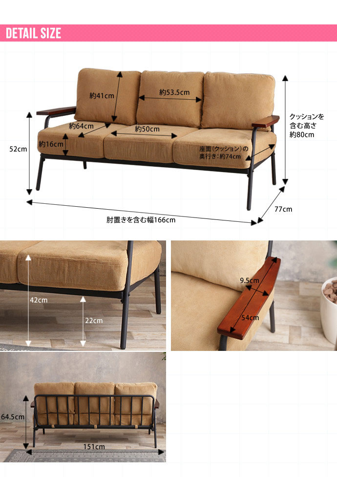 幅:166cm×奥行:77cm×高さ:80cm【座面高】約42cm