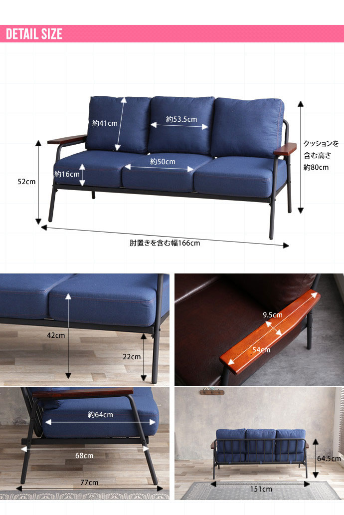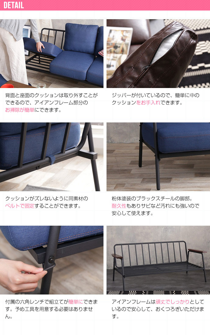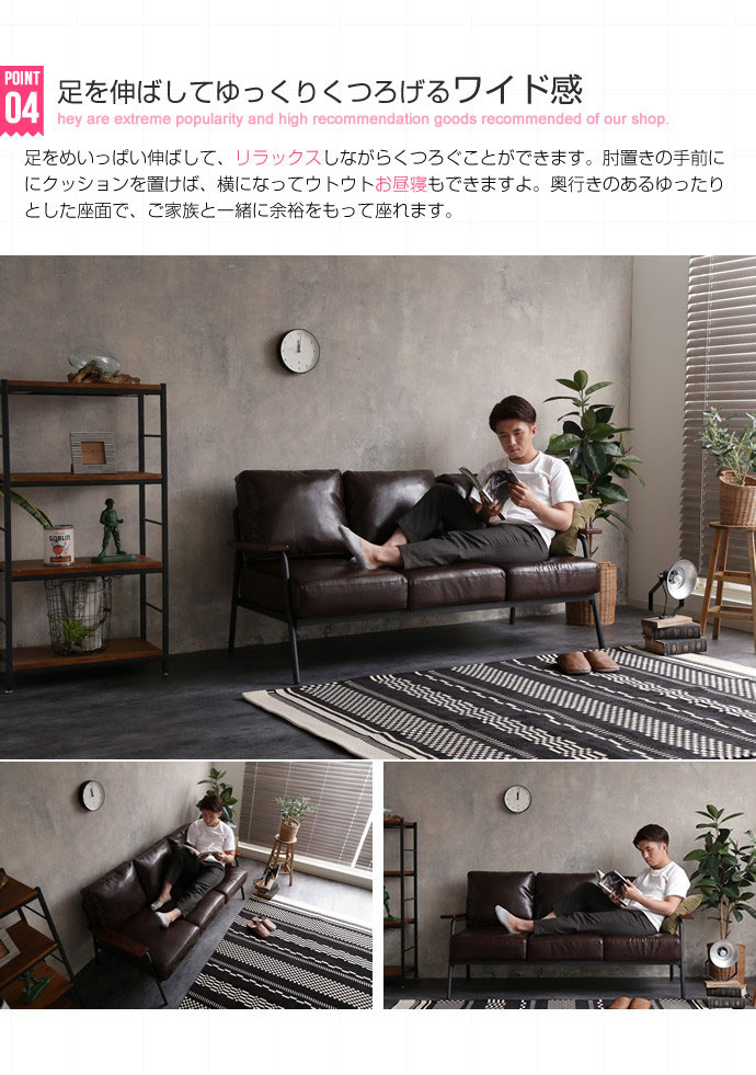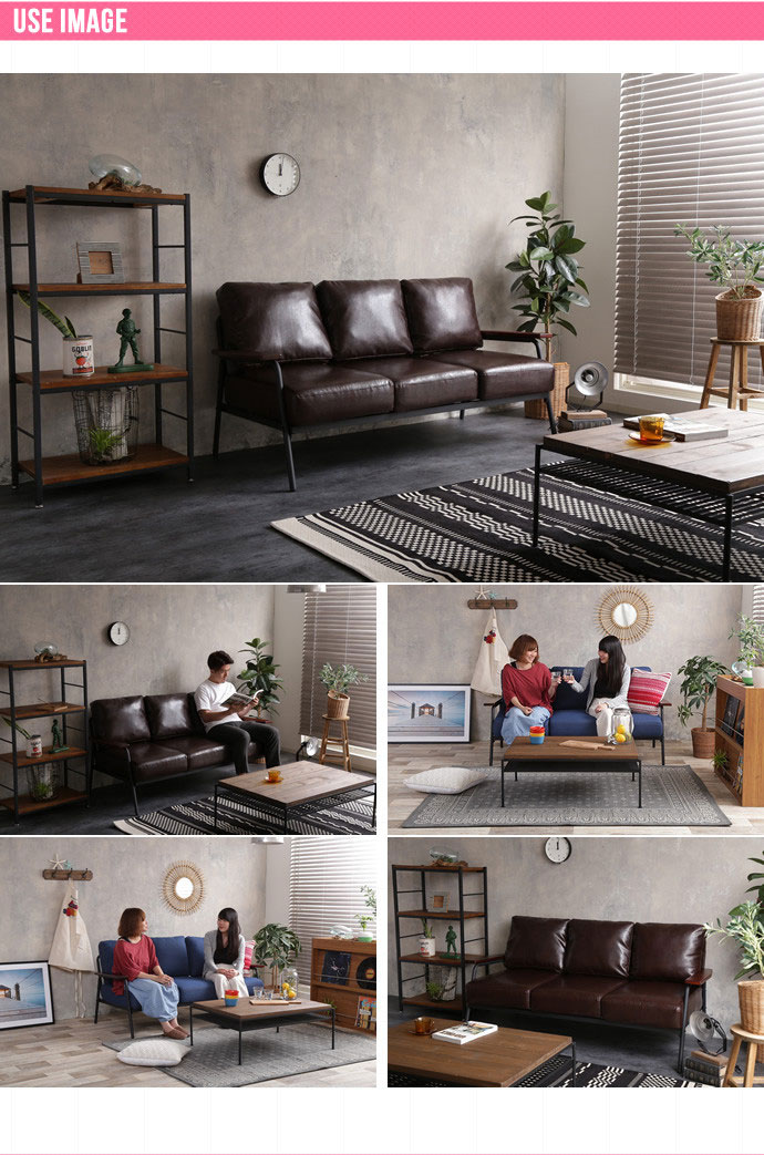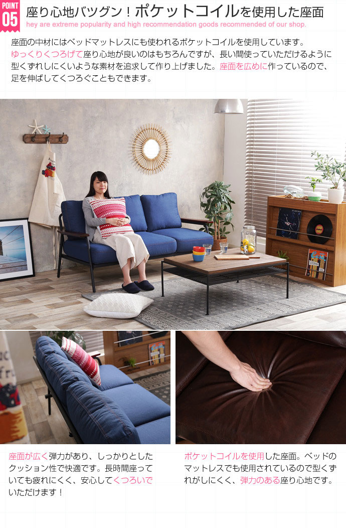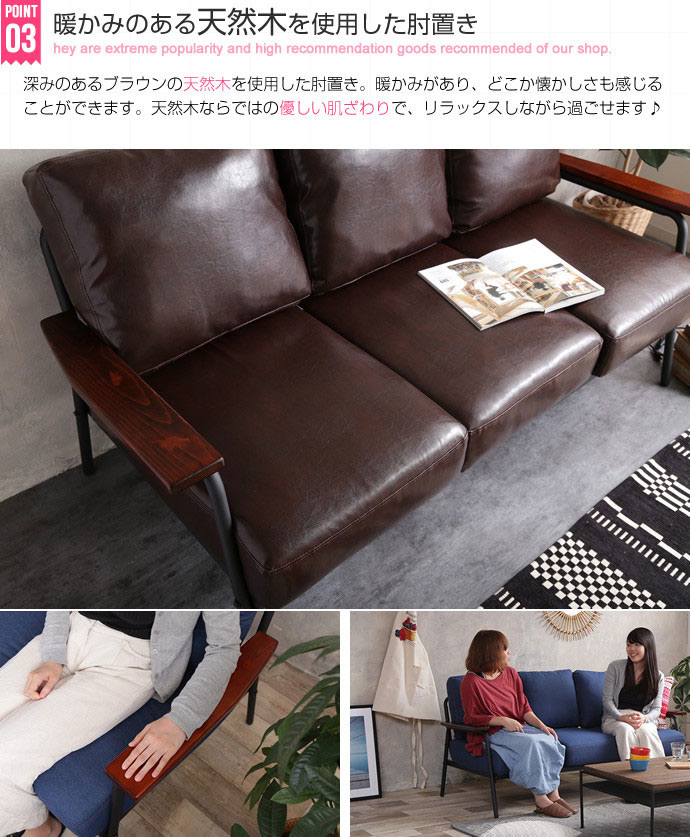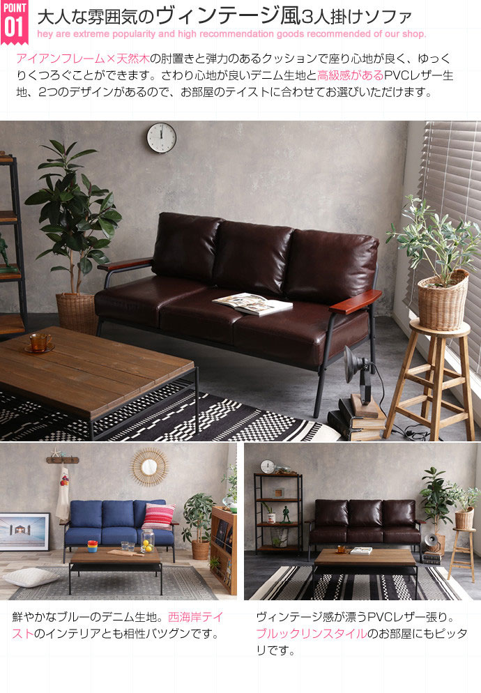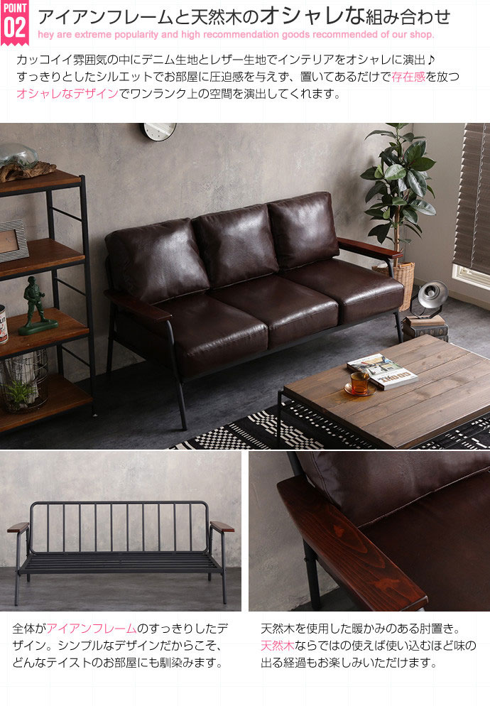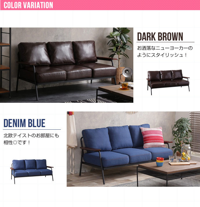 ブラックスチールのフレームと天然木の肘置きを組み合わせたヴィンテージ感あふれる大人な雰囲気の『Basquiat』3人掛けソファ。ブルックリンスタイルから西海岸テイストのインテリアまで幅広く合わせていただけるデザインとなっております。カラーは、PVCレザー張りのブラウンとデニム生地を使用したデニムブルーの2色をご用意。お部屋に合わせてお選びください。