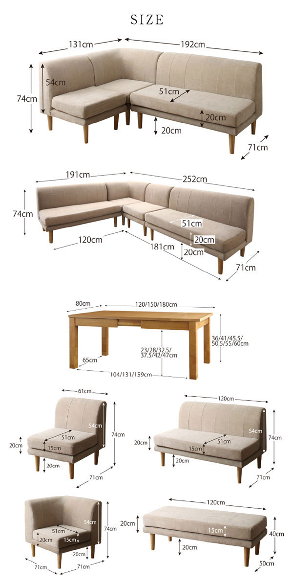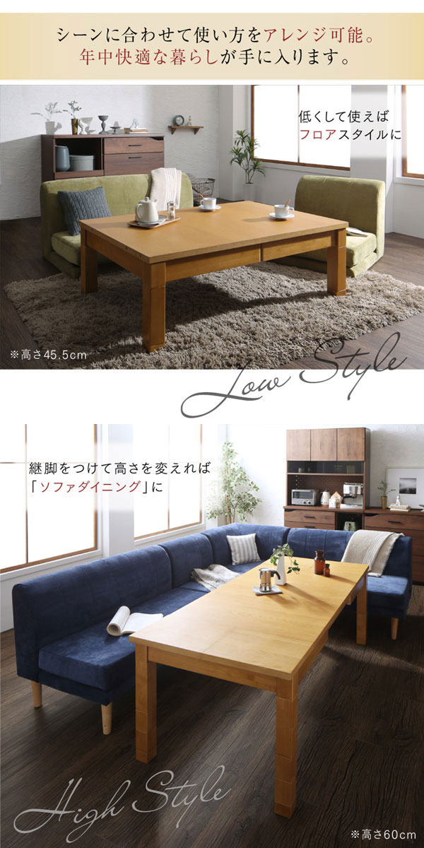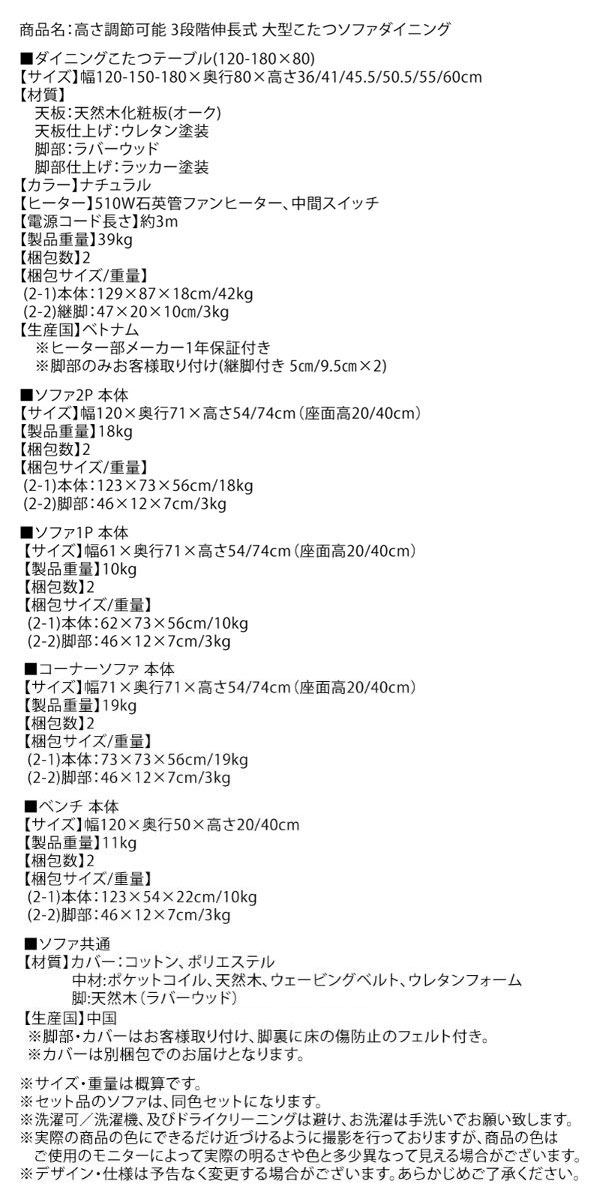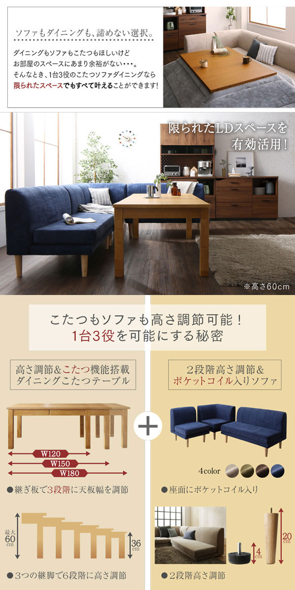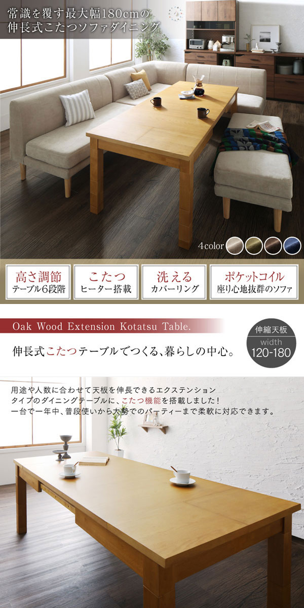 • 品名 高さが調節できる、伸長式こたつソファダイニングテーブルセット Escher【エッシャー】5点セット(テーブル+2Pソファ2脚+1Pソファ1脚+コーナーソファ1脚) 幅120-180cm 6人掛け