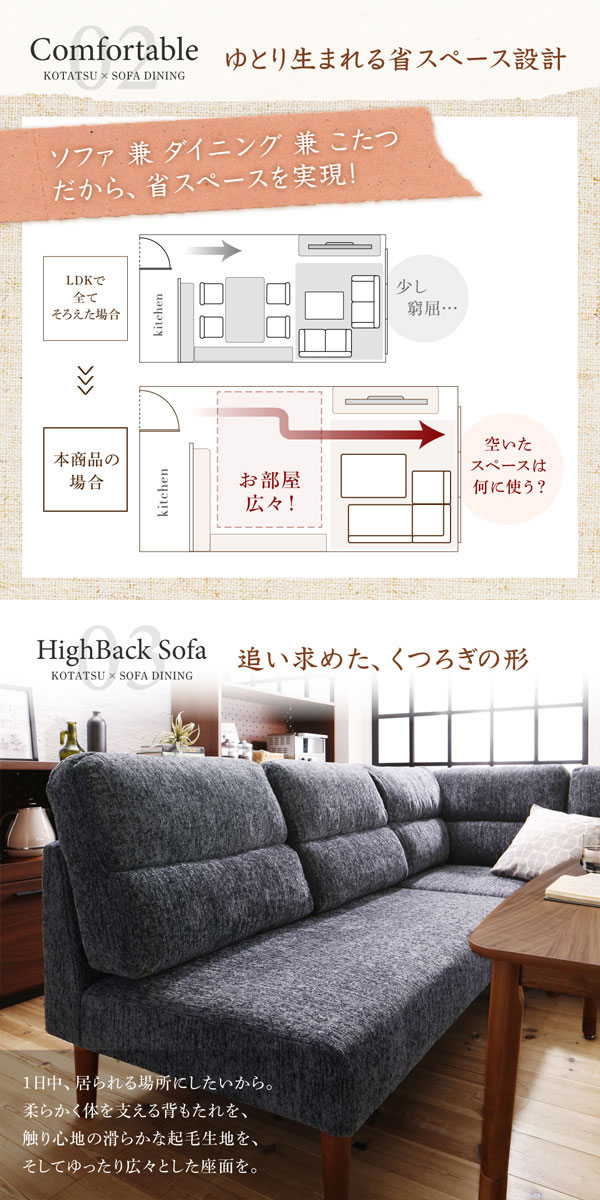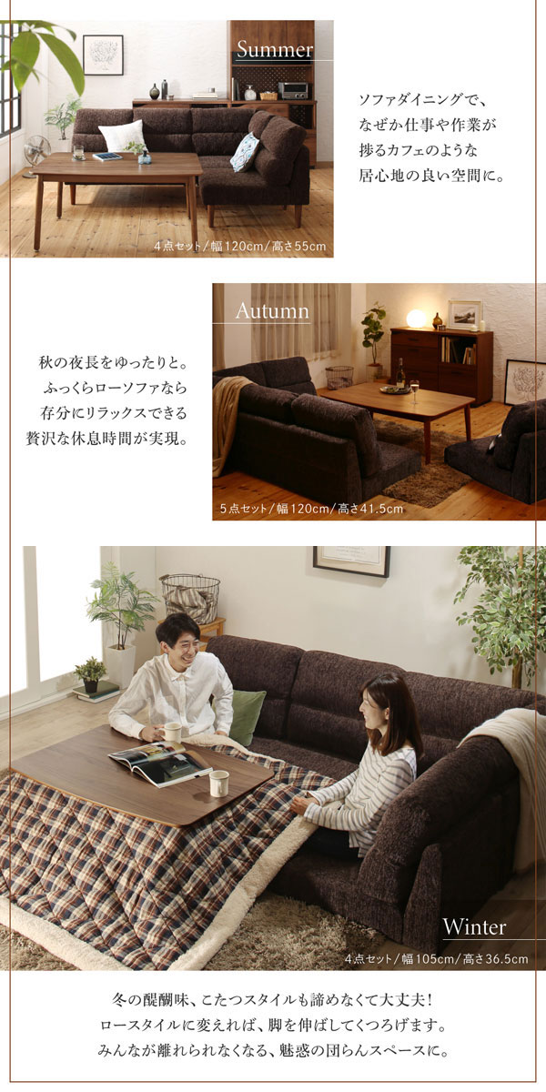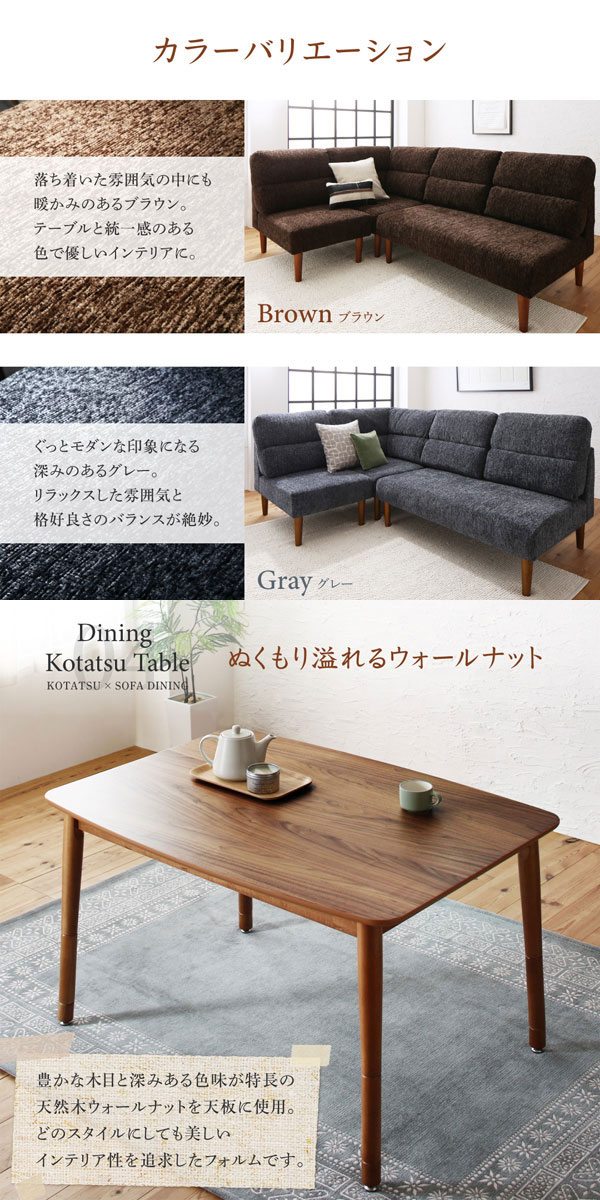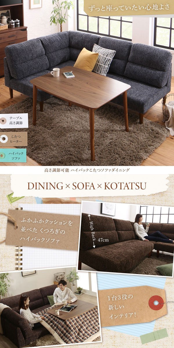 • 品名 高さが調節できる、ハイバックこたつダイニングソファセット Laurent2【ローラン2】5点セット(ダイニングテーブル+2Pソファ1脚+1Pソファ2脚+コーナーソファ1脚) 幅105cm 5人掛け