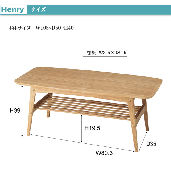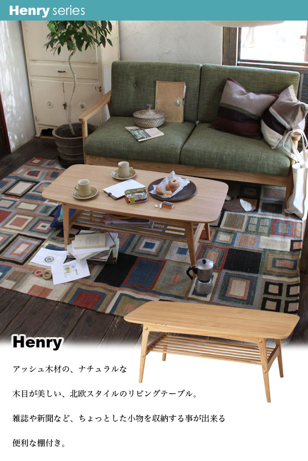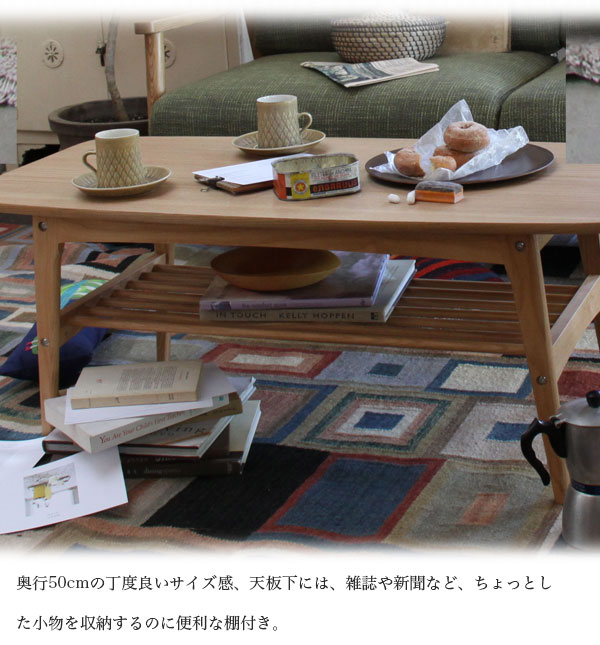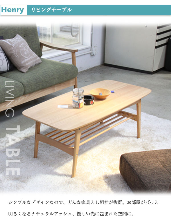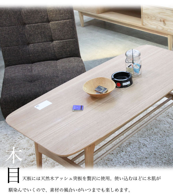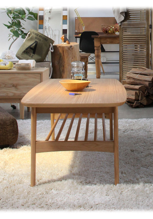 アッシュ木材のナチュラルな木目が美しい、棚付きのリビングテーブル、