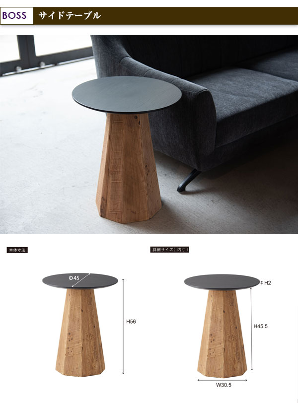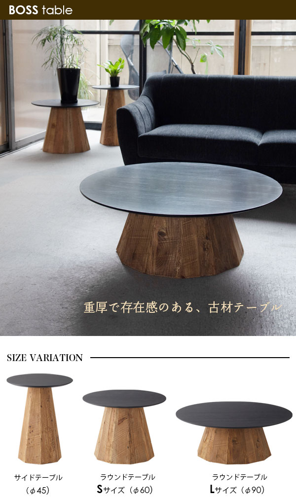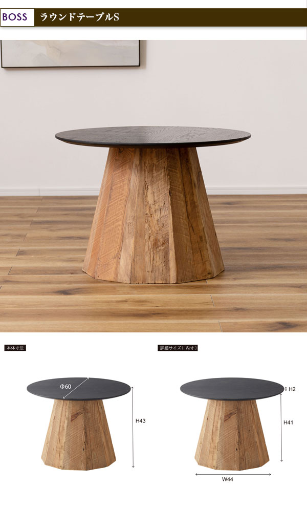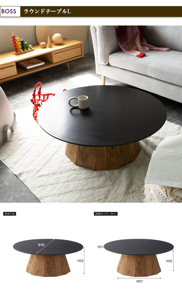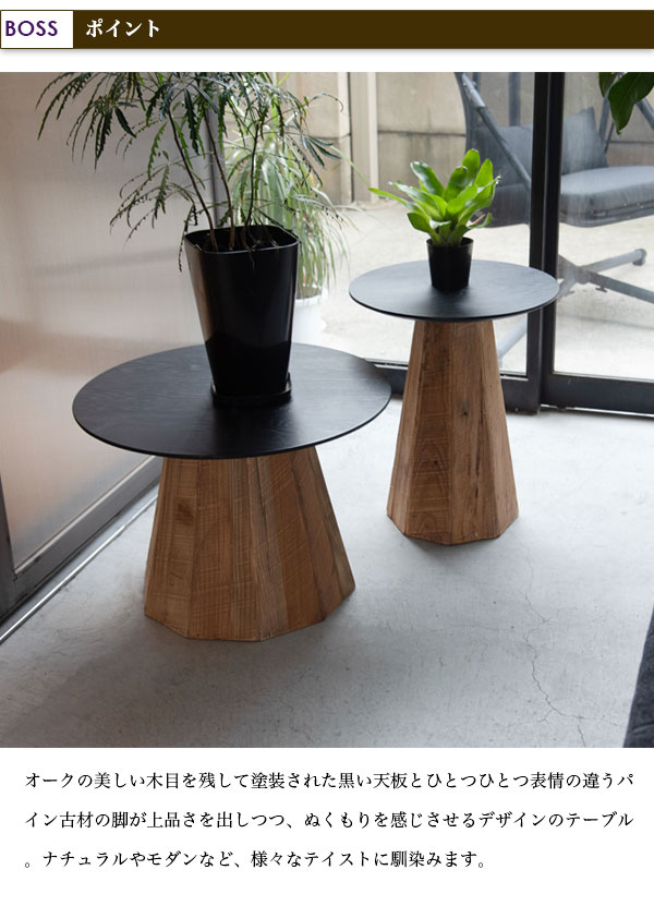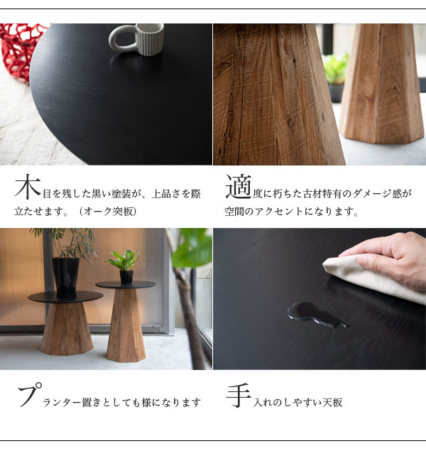 オークの美しい木目を残して塗装された黒い天板とひとつひとつ表情の違うパイン古材の脚が上品さを出しつつ、ぬくもりを感じさせるデザインのテーブル。ナチュラルやモダンなど、様々なテイストに馴染みます。