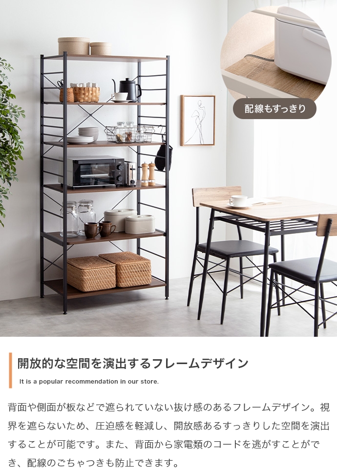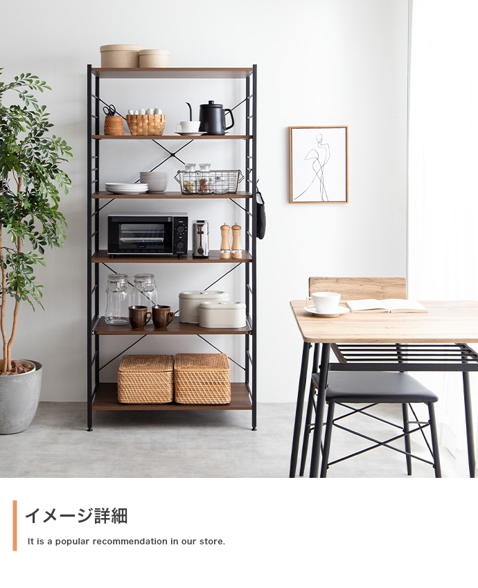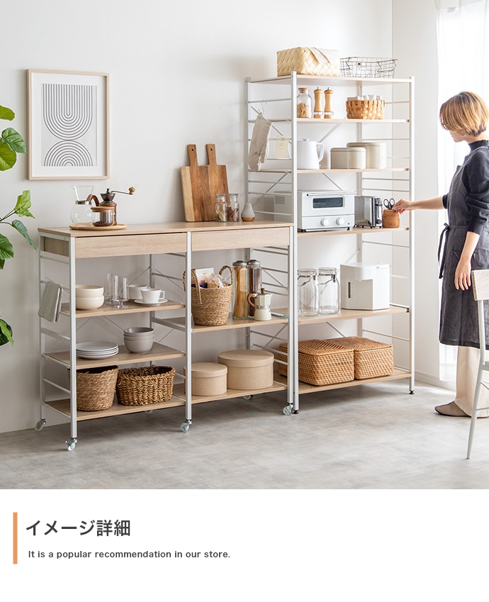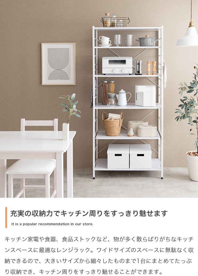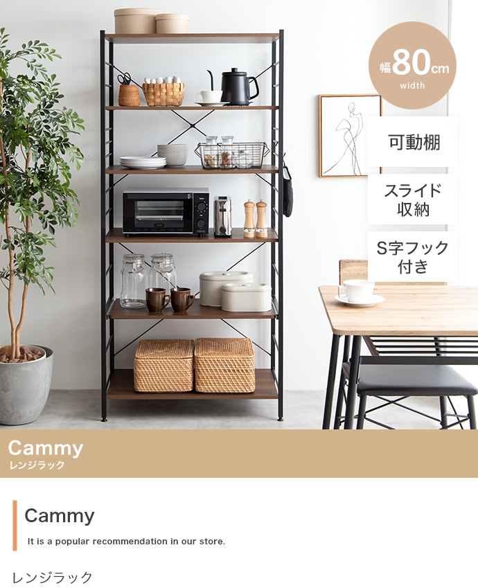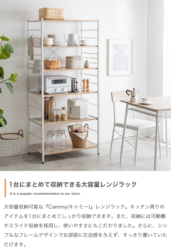 たっぷり大容量収納を叶える『Cammy(キャミー)』のレンジラック。幅80cmと豊富な収納力を備えており、キッチンに不可欠な家電や雑貨・食器等をまとめて1台に収納していただけます。また、シンプルなフレームデザインは視界を遮らず、圧迫感を与えないため、お部屋をすっきり見せたい方にもおすすめです。