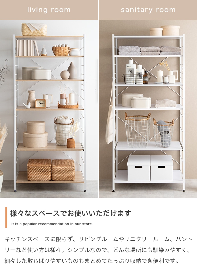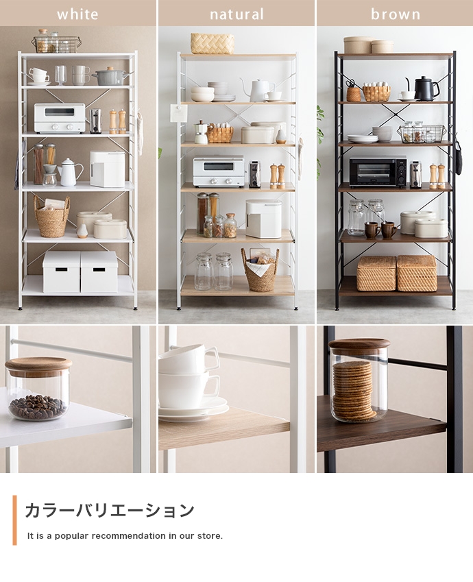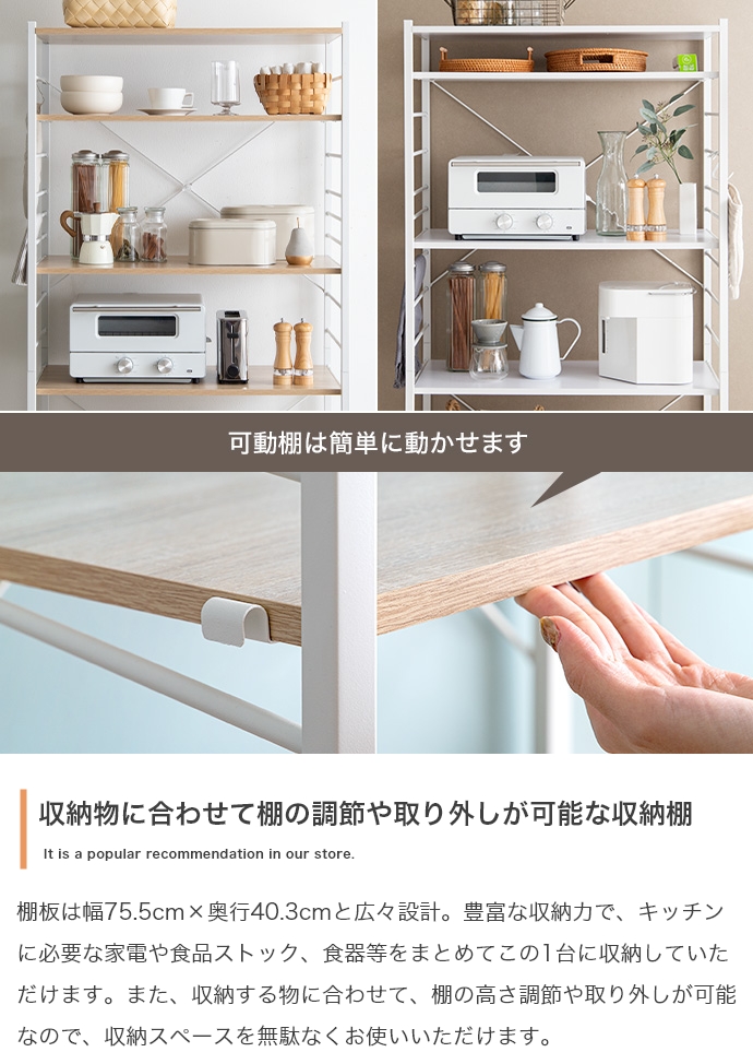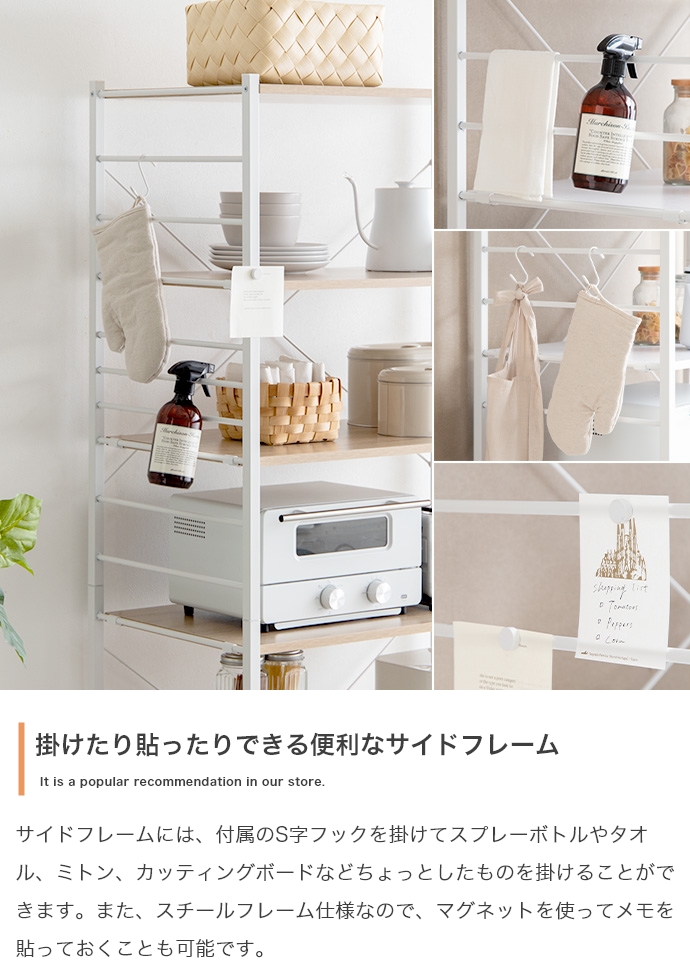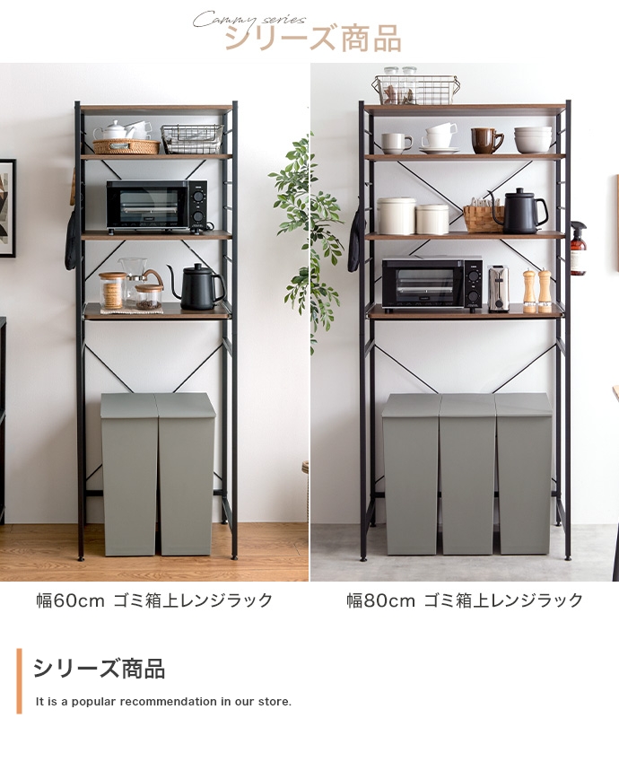 たっぷり大容量収納を叶える『Cammy(キャミー)』のレンジラック。幅80cmと豊富な収納力を備えており、キッチンに不可欠な家電や雑貨・食器等をまとめて1台に収納していただけます。また、シンプルなフレームデザインは視界を遮らず、圧迫感を与えないため、お部屋をすっきり見せたい方にもおすすめです。