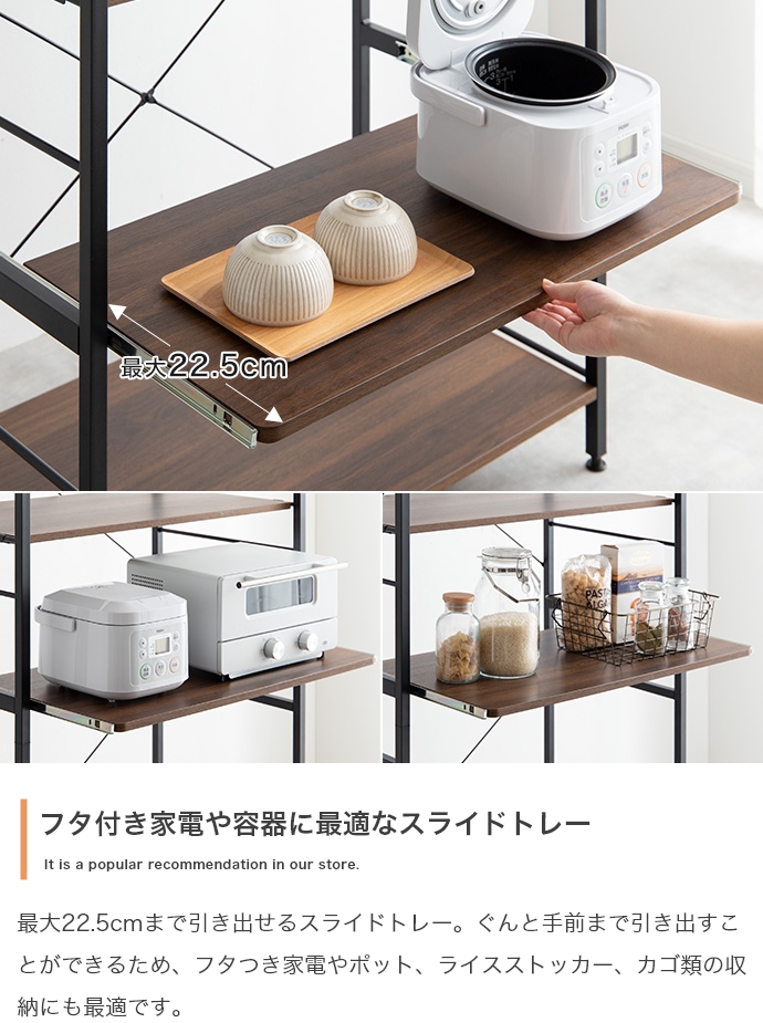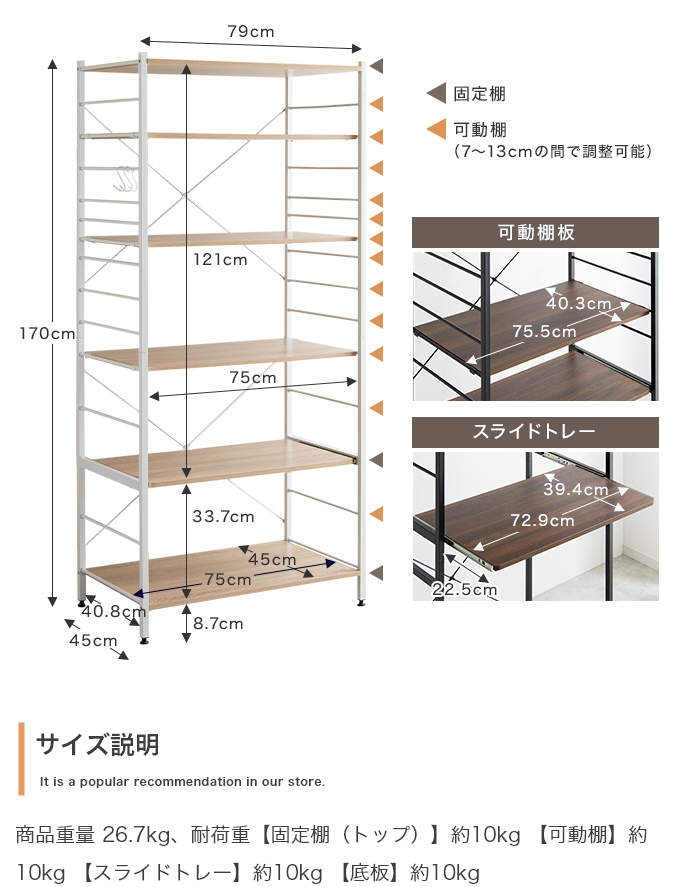 【耐荷重】各棚:約10kg、スライドトレー:約10kg