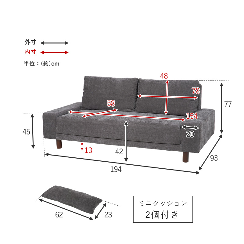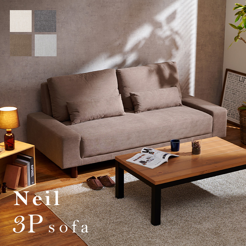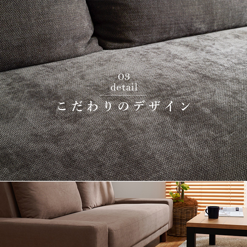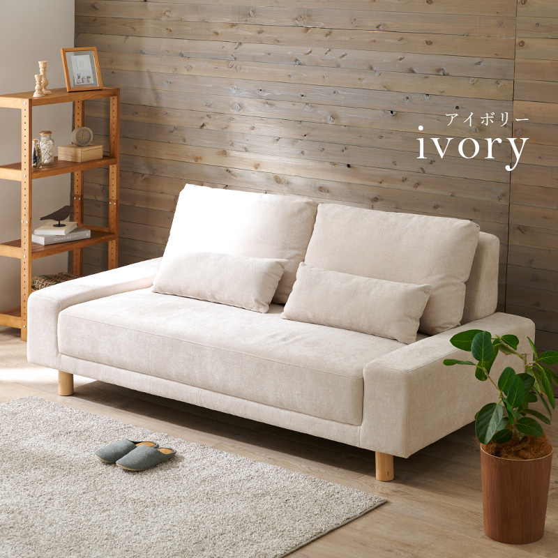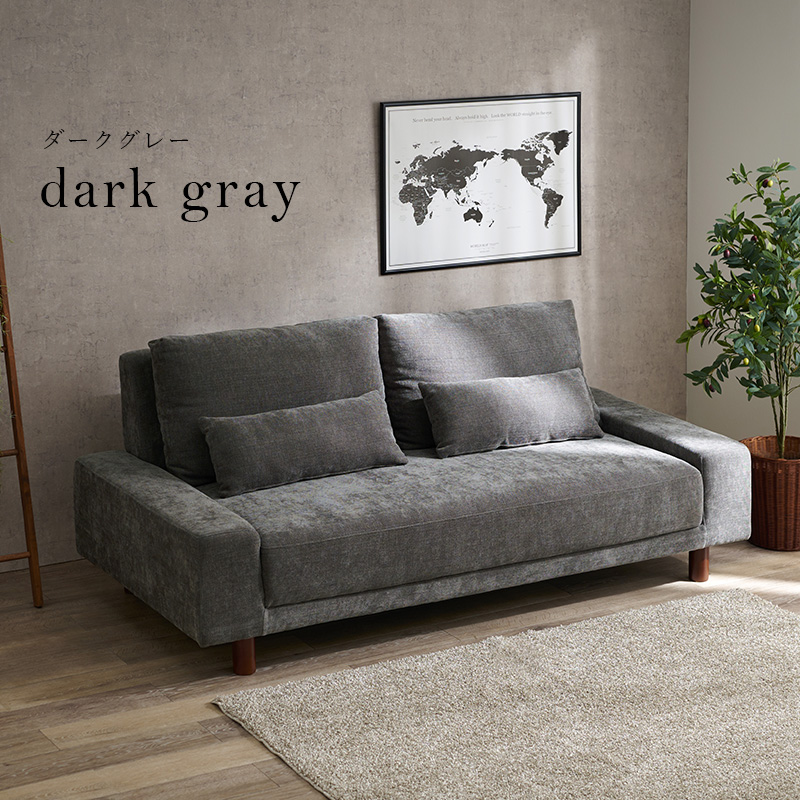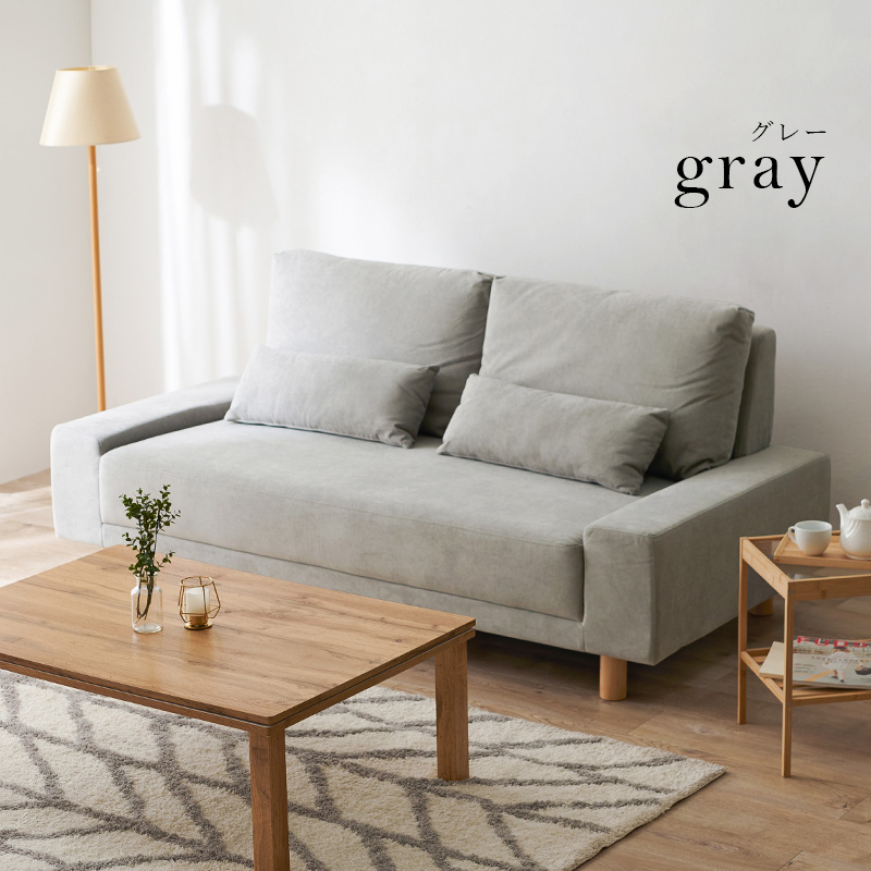 低めのフラット肘、ゆったりと広い座面で寝転んでくつろげるソファ。ロー/ハイ兼用