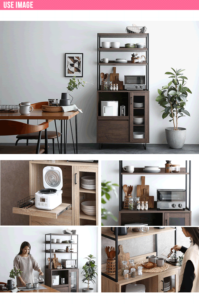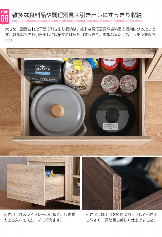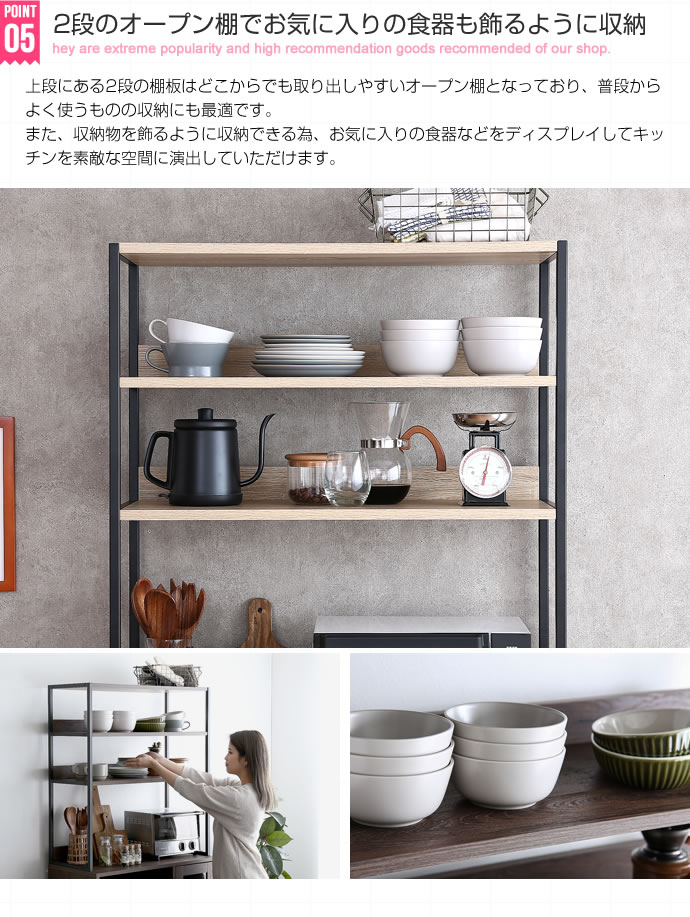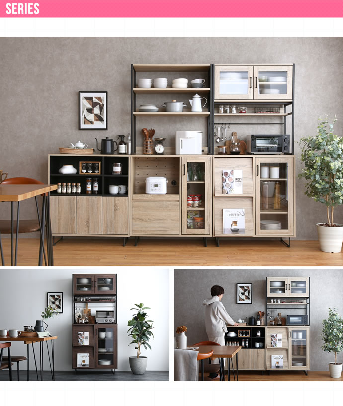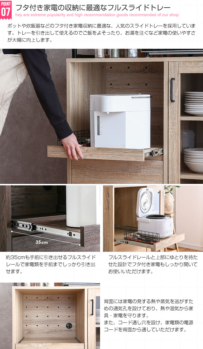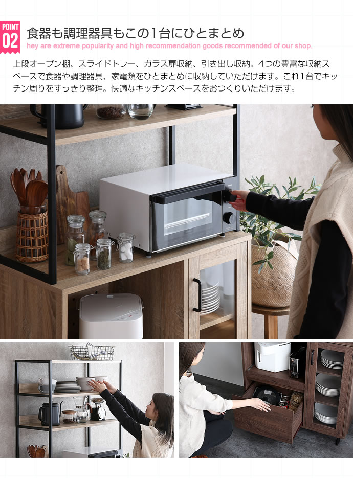 1台で食器や調理家電をまとめて収納できるオープン棚・ガラス扉・スライドトレー付き食器棚です。
