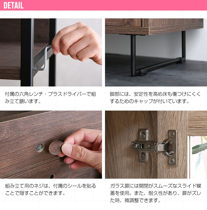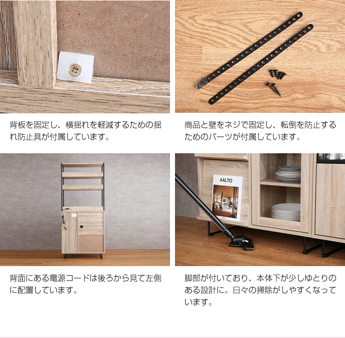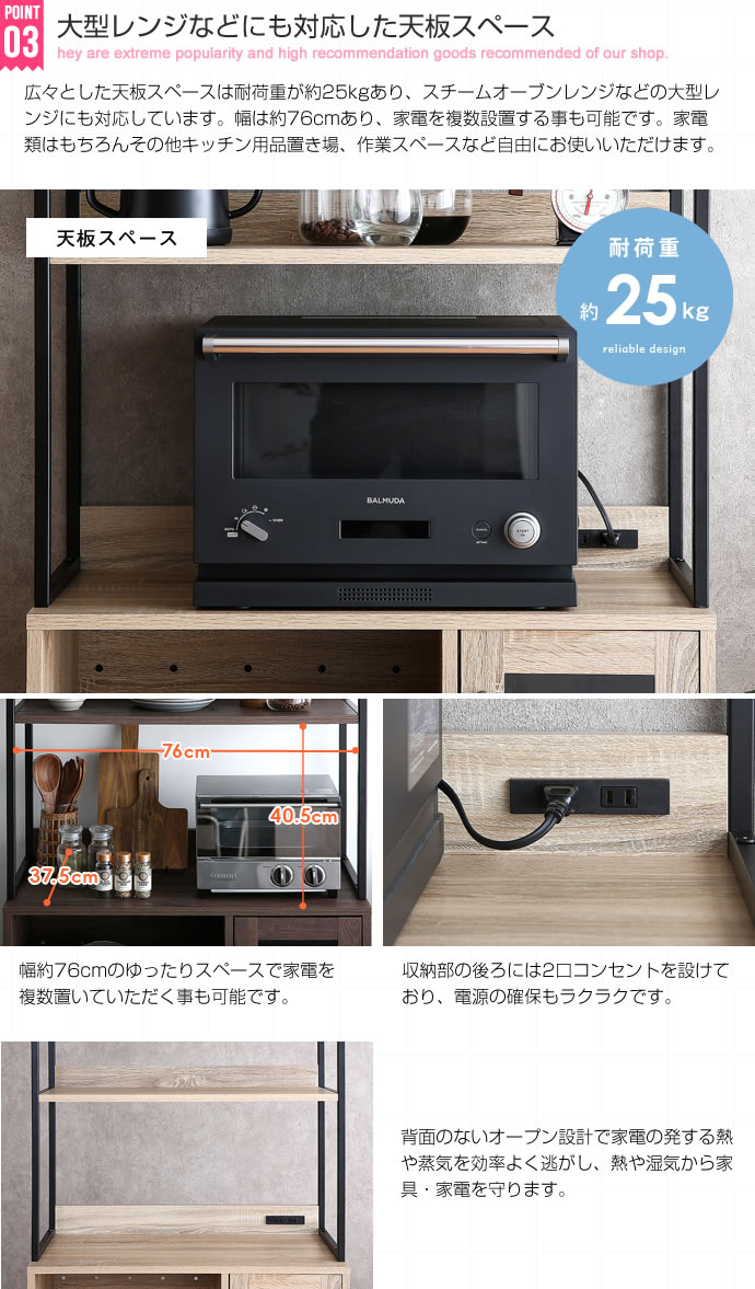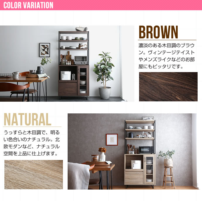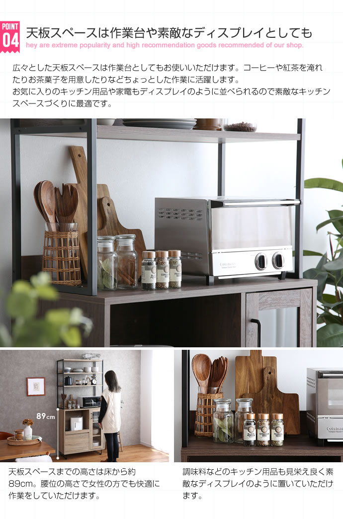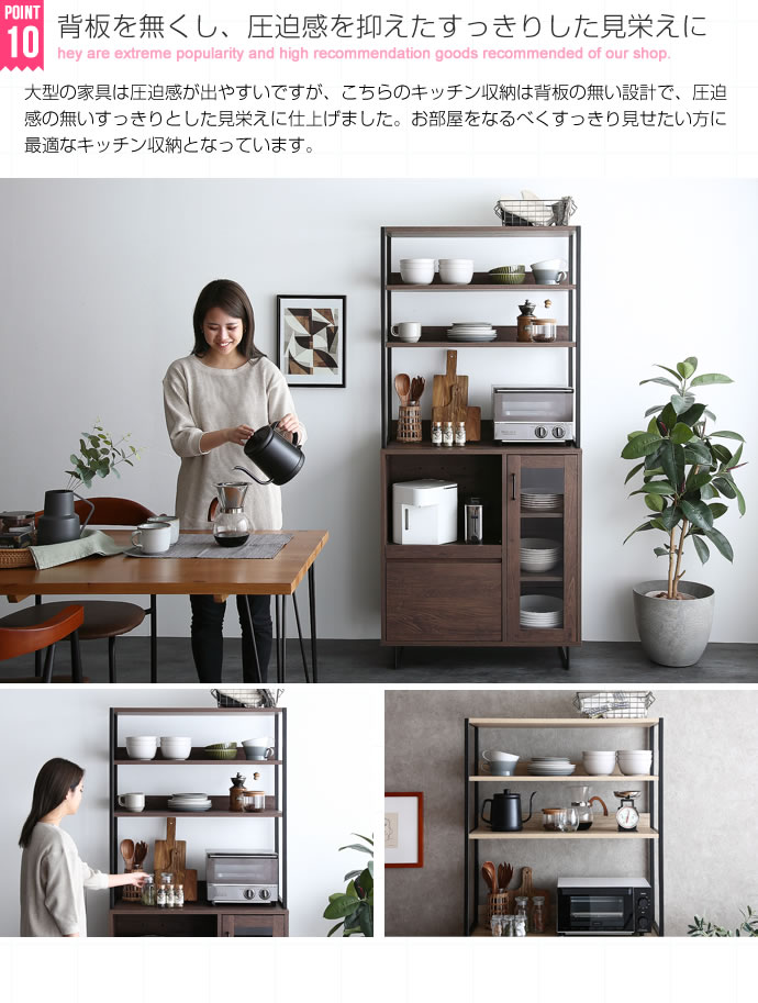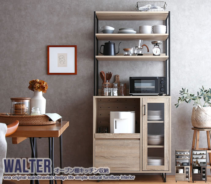 1台で食器や調理家電をまとめて収納できるオープン棚・ガラス扉・スライドトレー付き食器棚です。