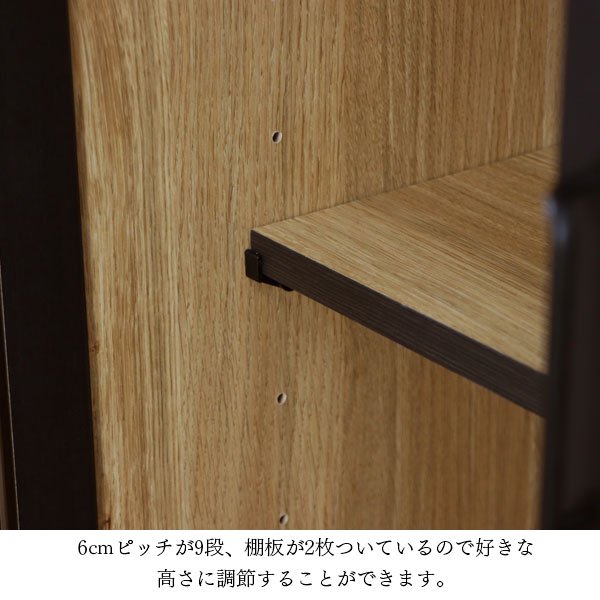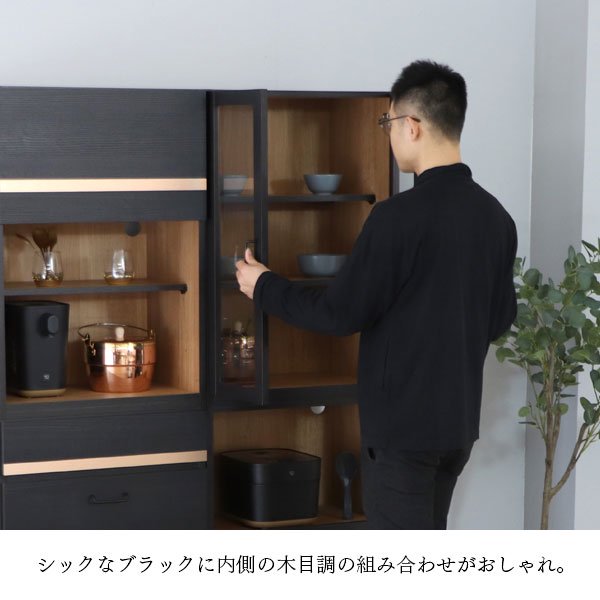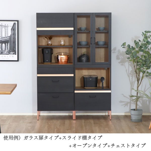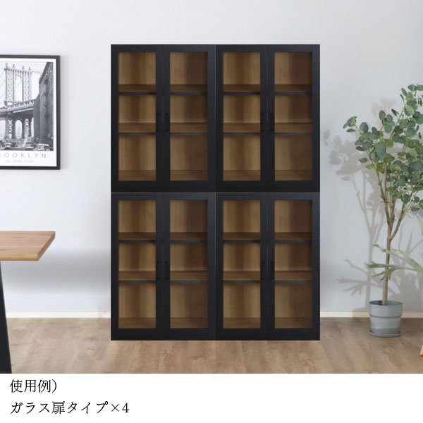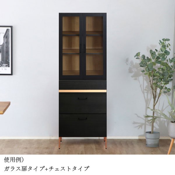 上下2つの組合せだけでも50通り以上の組み合わせが可能で、暮らしに合わせたあなただけのオリジナル収納が完成します。高さを出して収納力を出すのも、カウンターとして、ちょっとした作業台や飾り棚としても活用できます。コッパーカラーと黒の木目のコントラストがクールでオシャレなアイテムです。扉は両開きタイプで、持ちやすい細身の取っ手です。