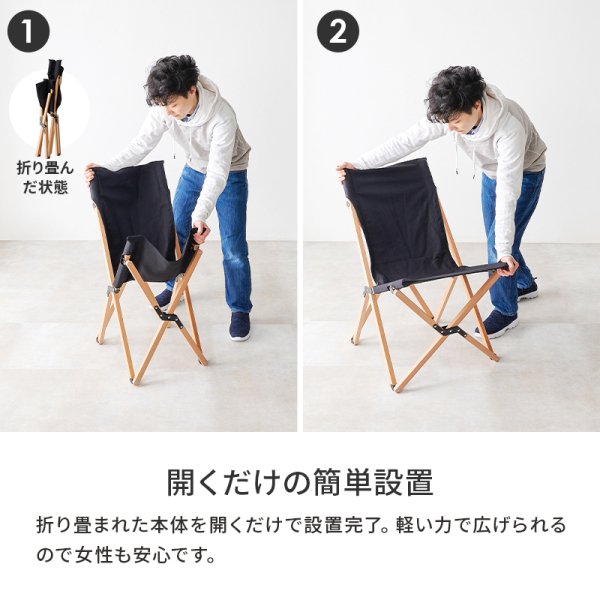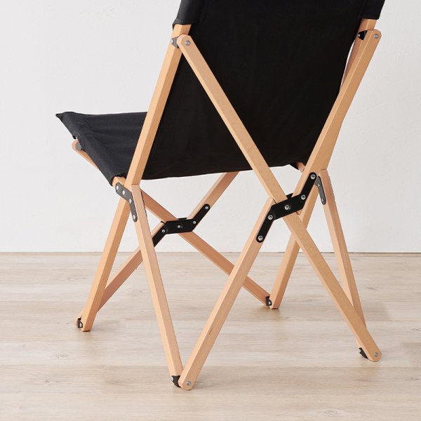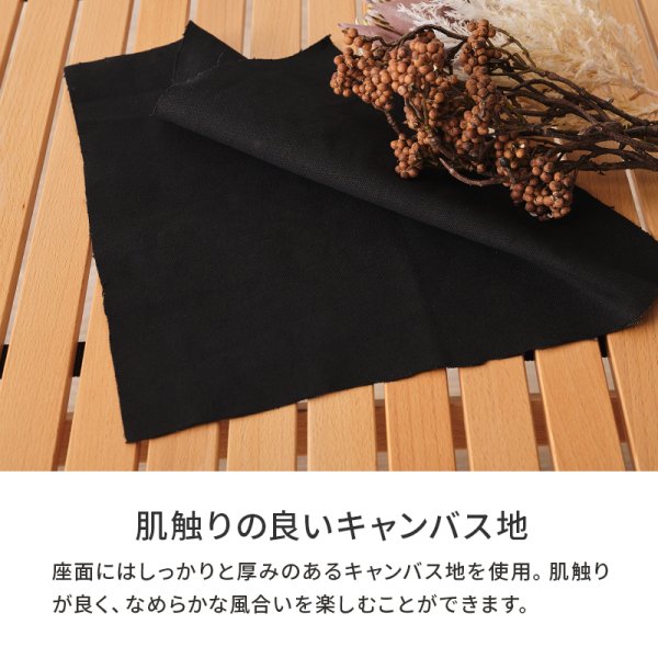 座面にはしっかりと厚みのあるキャンパス地を使用、肌触りが良く、なめらかな風合いを楽しむことが出来ます。ブラックと天然木の組み合わせでモダンな印象に。