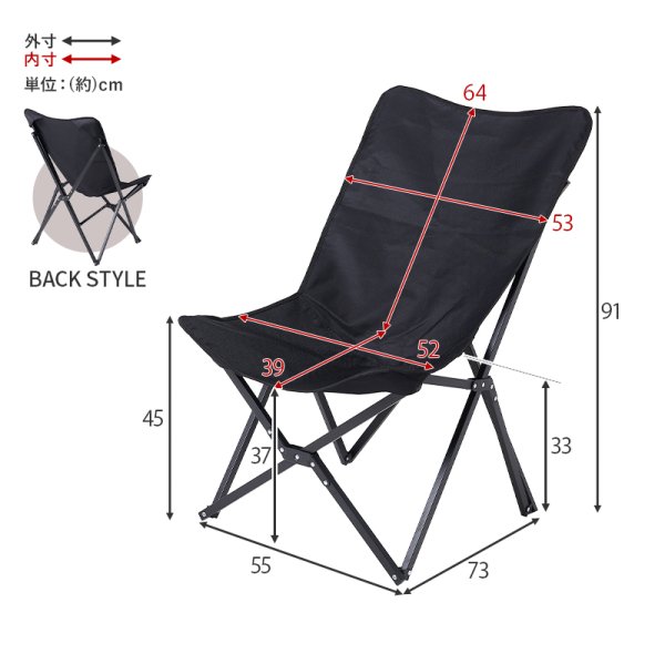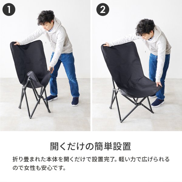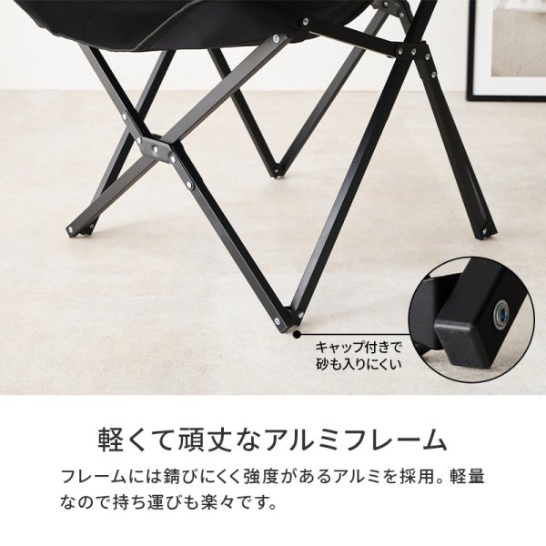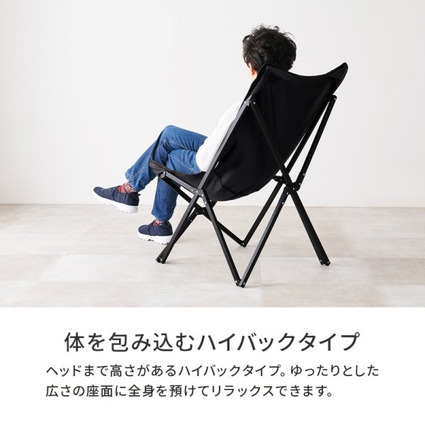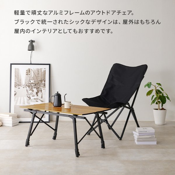 軽量で頑丈なアルミフレームのアウトドアチェア。ブラックで統一されたシックなデザインは、アウトドアだけでなく、お部屋のインテリアとしてもおすすめです。折り畳み式で持ち運びやすくハイバック仕様なのでゆったりくつろげます。