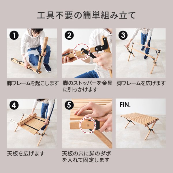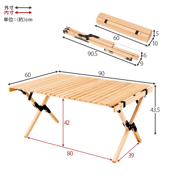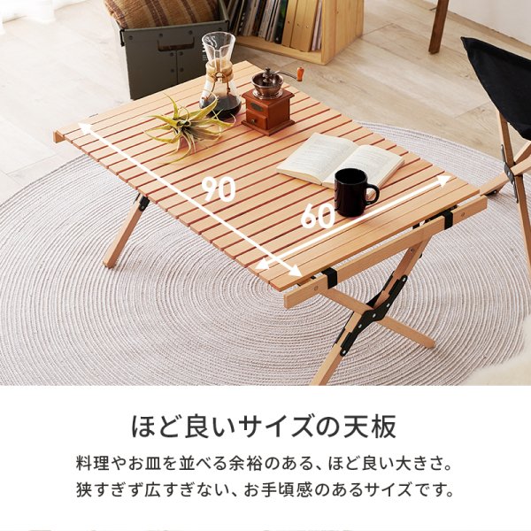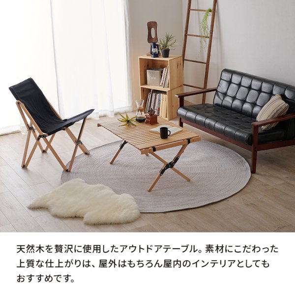 天然木を使用したアウトドアテーブル。素材にこだわった上質な仕上がりは、屋外はもちろん屋内のインテリアとしてもおすすめです。ロールタイプの天板でコンパクトに折りたためて持ち運びにも便利。