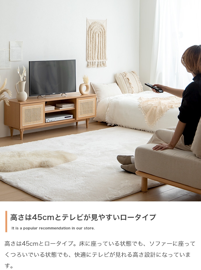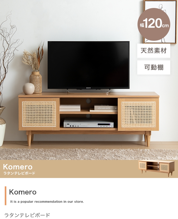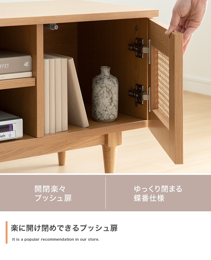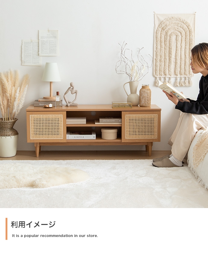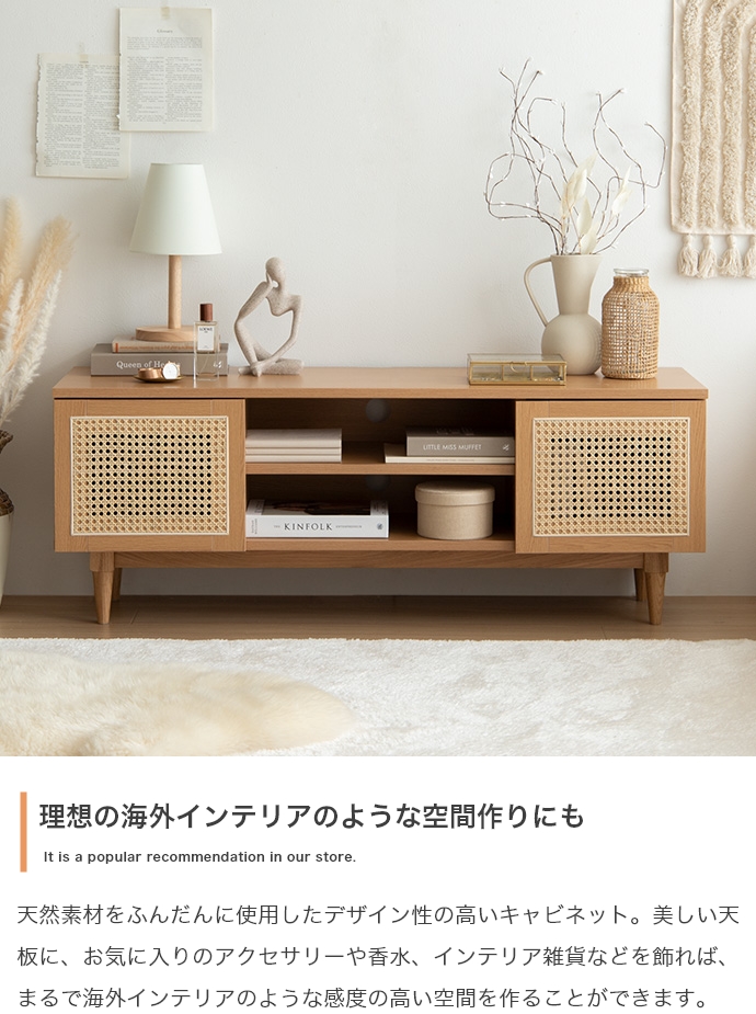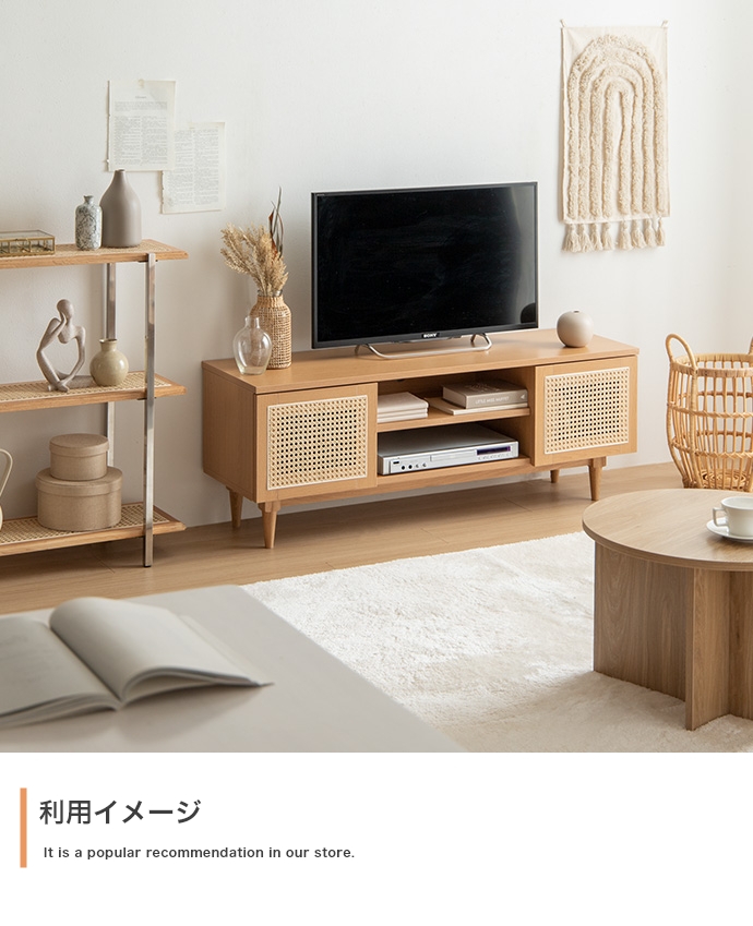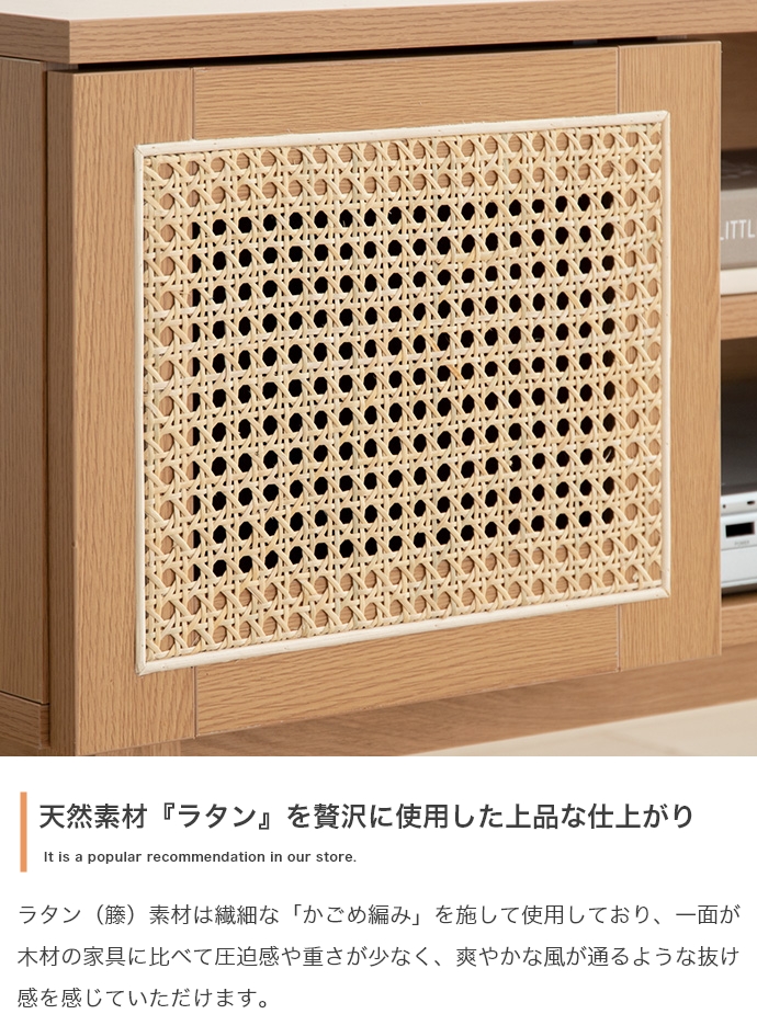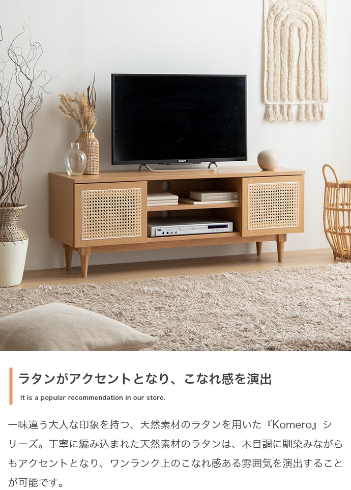 天然ラタンと美しい木目調を使用した、上質さ溢れる『Komero(コメロ)』ラタンテレビボード。扉には本物の籐(ラタン)を、本体にはリアルな木目調を施し、ナチュラル感溢れるデザインに仕上げました。また、圧迫感を与えない程よいサイズ感は、広いお部屋やワンルームなどお部屋の広さを選ばず置いていただけます。また、すっきりしたフォルムながらも、収納力も抜群。生活感溢れるごちゃつきがちな小物や、機械類なども隠して収納でき、お部屋をすっきり見せることが可能です。韓国インテリアに最適!