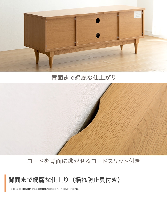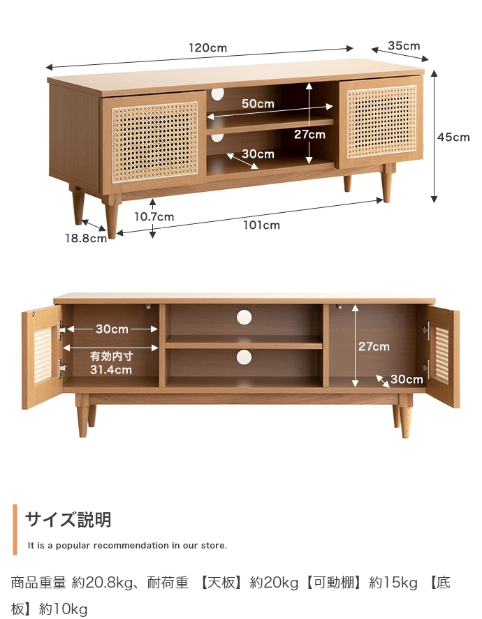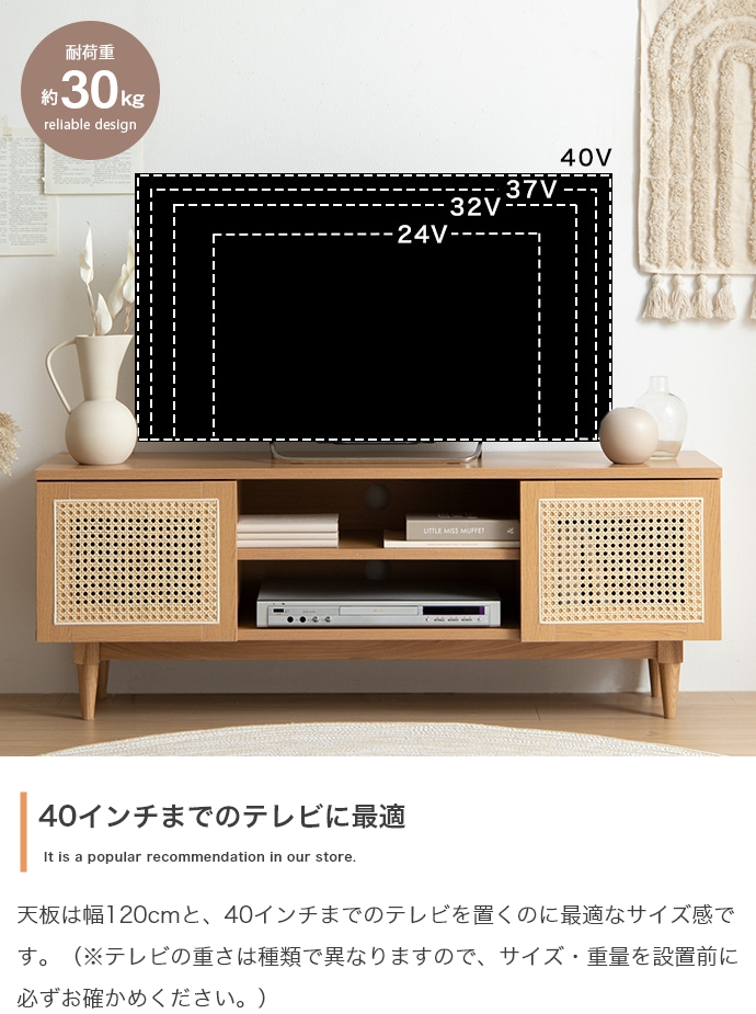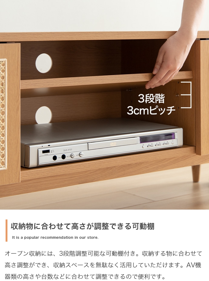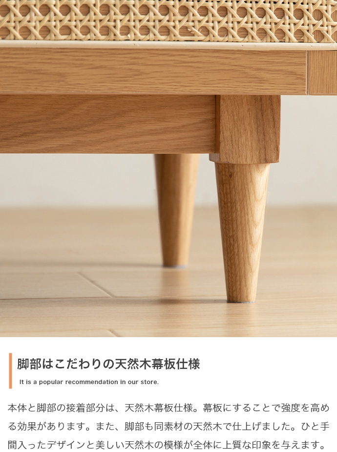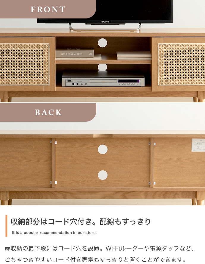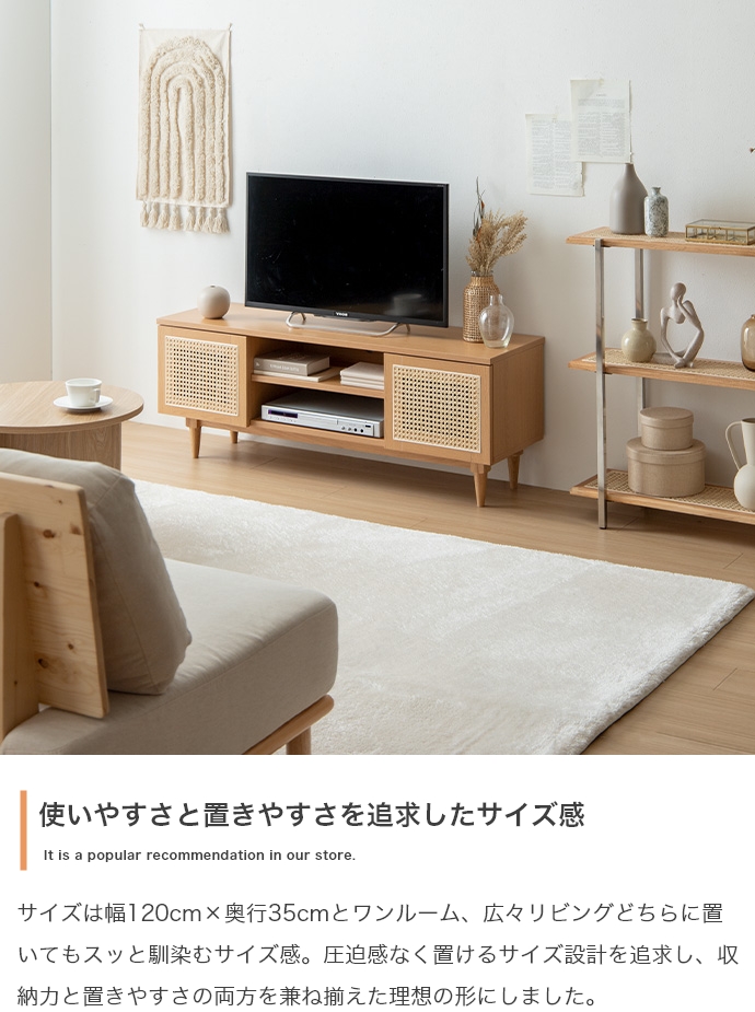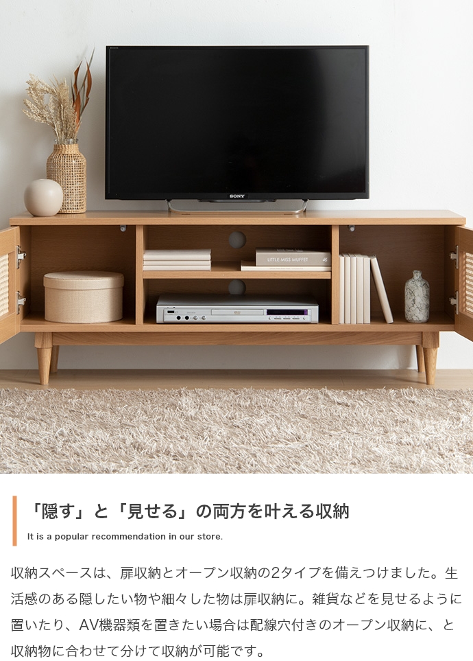 天然ラタンと美しい木目調を使用した、上質さ溢れる『Komero(コメロ)』ラタンテレビボード。扉には本物の籐(ラタン)を、本体にはリアルな木目調を施し、ナチュラル感溢れるデザインに仕上げました。また、圧迫感を与えない程よいサイズ感は、広いお部屋やワンルームなどお部屋の広さを選ばず置いていただけます。また、すっきりしたフォルムながらも、収納力も抜群。生活感溢れるごちゃつきがちな小物や、機械類なども隠して収納でき、お部屋をすっきり見せることが可能です。韓国インテリアに最適!