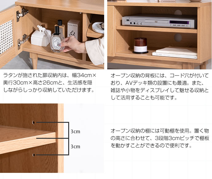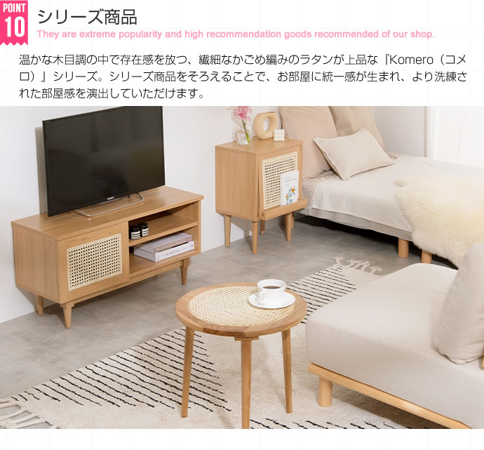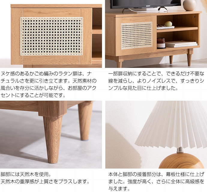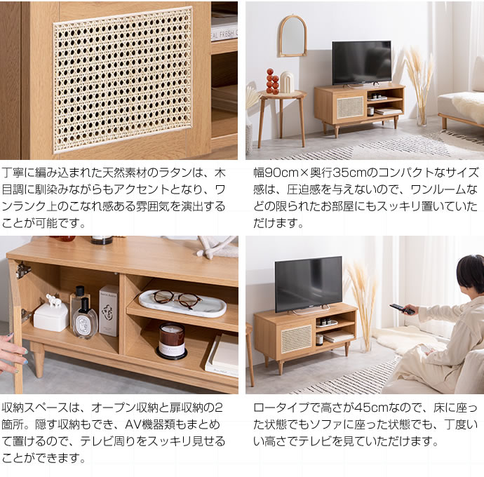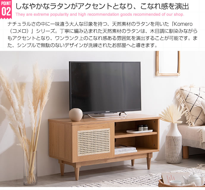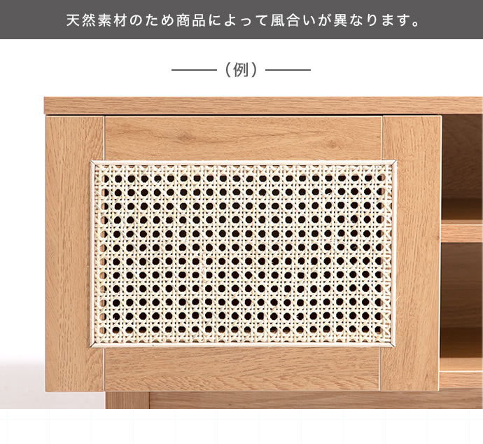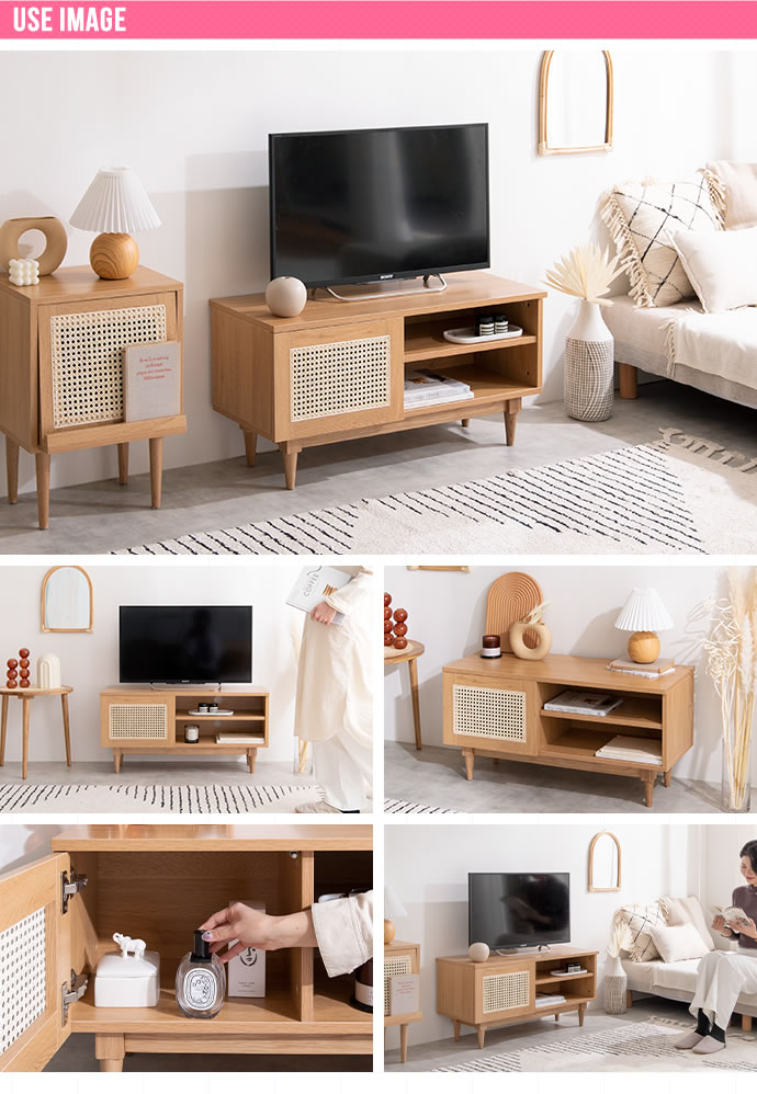 天然ラタンと美しい木目調を使用した、上質さ溢れる『Komero(コメロ)』ラタンテレビボード。扉には本物の籐(ラタン)を、本体にはリアルな木目調を施し、ナチュラル感溢れるデザインに仕上げました。また、圧迫感を与えないコンパクトなサイズなので、ワンルームなどのお部屋に置いていただけます。また、すっきりしたフォルムながらも、収納力も抜群。生活感溢れるごちゃつきがちな小物や、機械類なども隠して収納でき、お部屋をすっきり見せることが可能です。韓国インテリアに最適!