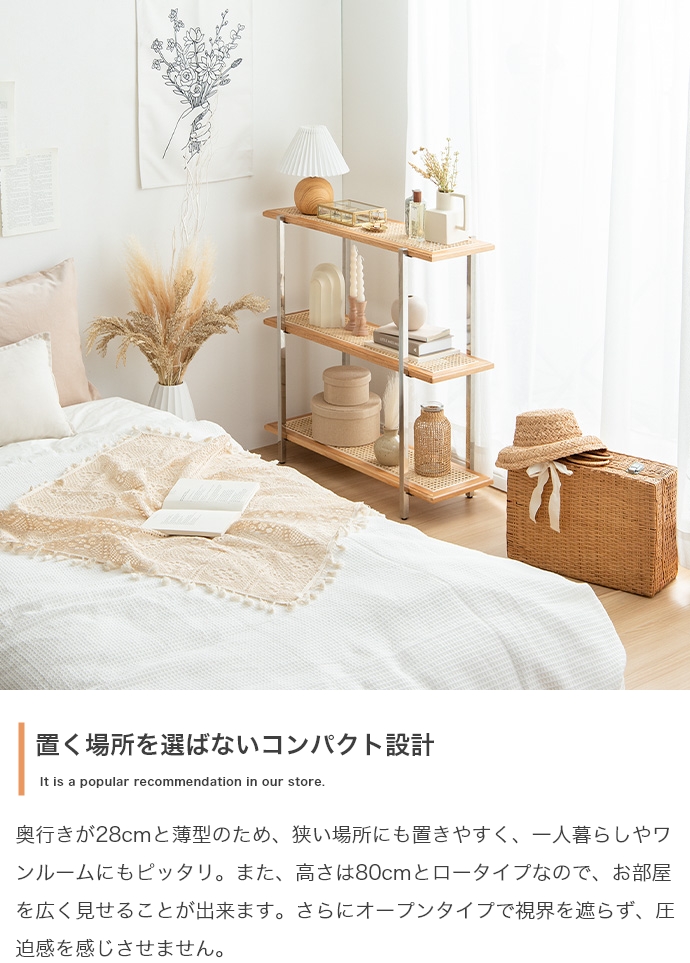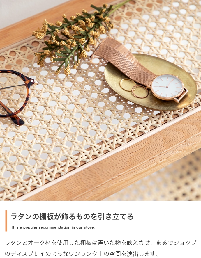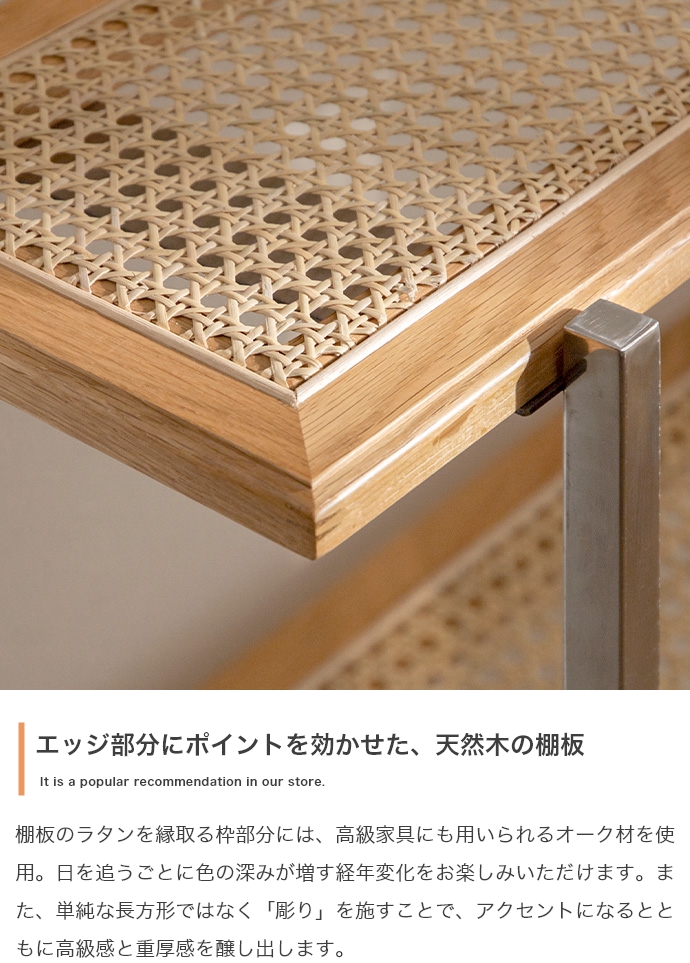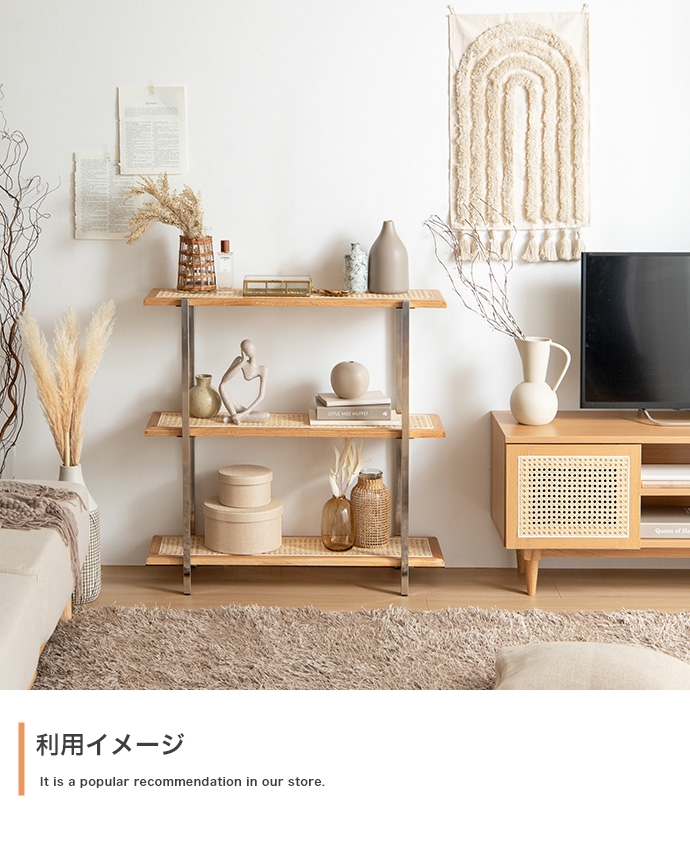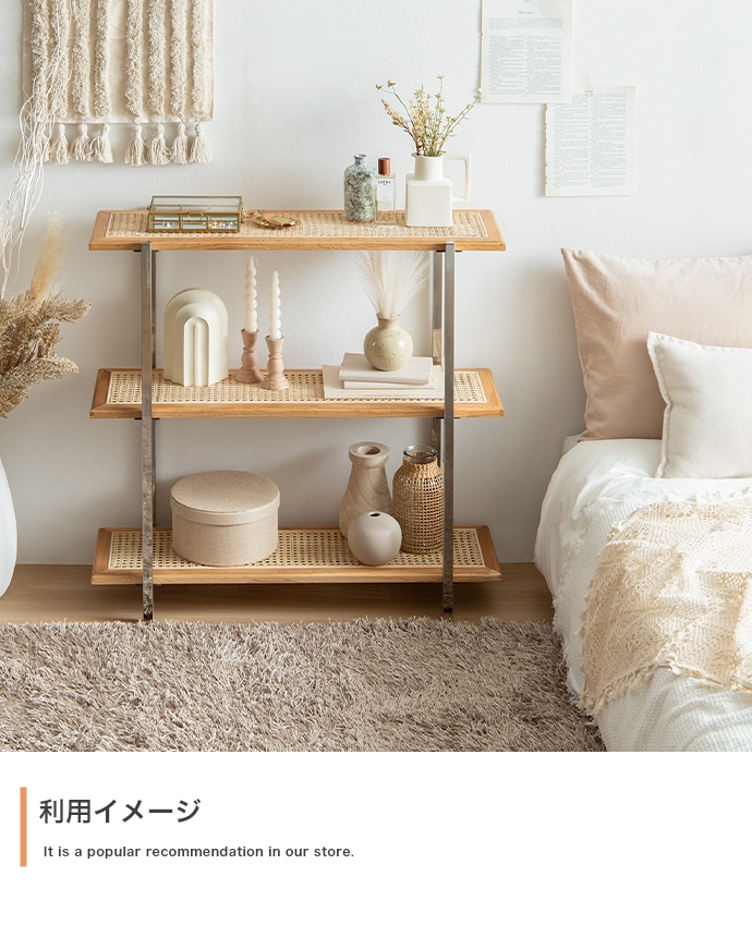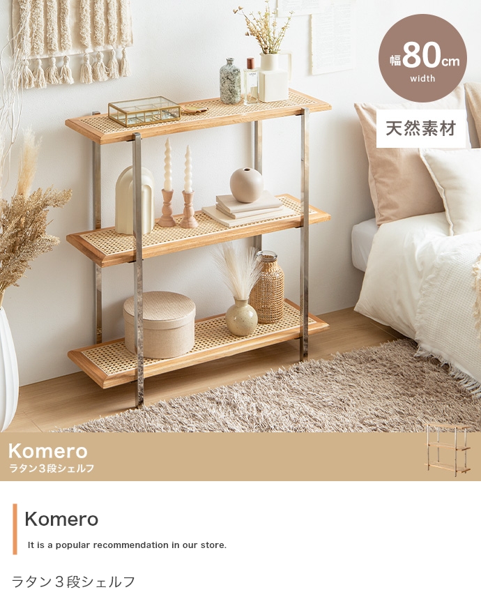 ナチュラルさの中に一味違う大人な印象を持つ、天然素材のラタンを用いた『Komero』3段シェルフ。天然素材『ラタン』と『オーク材』を贅沢に使用した上品な仕上がりで、ワンランク上のこなれ感ある雰囲気を演出することが可能です。また、置く場所を選ばないコンパクト設計なので、様々なお部屋に置くことが可能です。韓国インテリアに最適!
