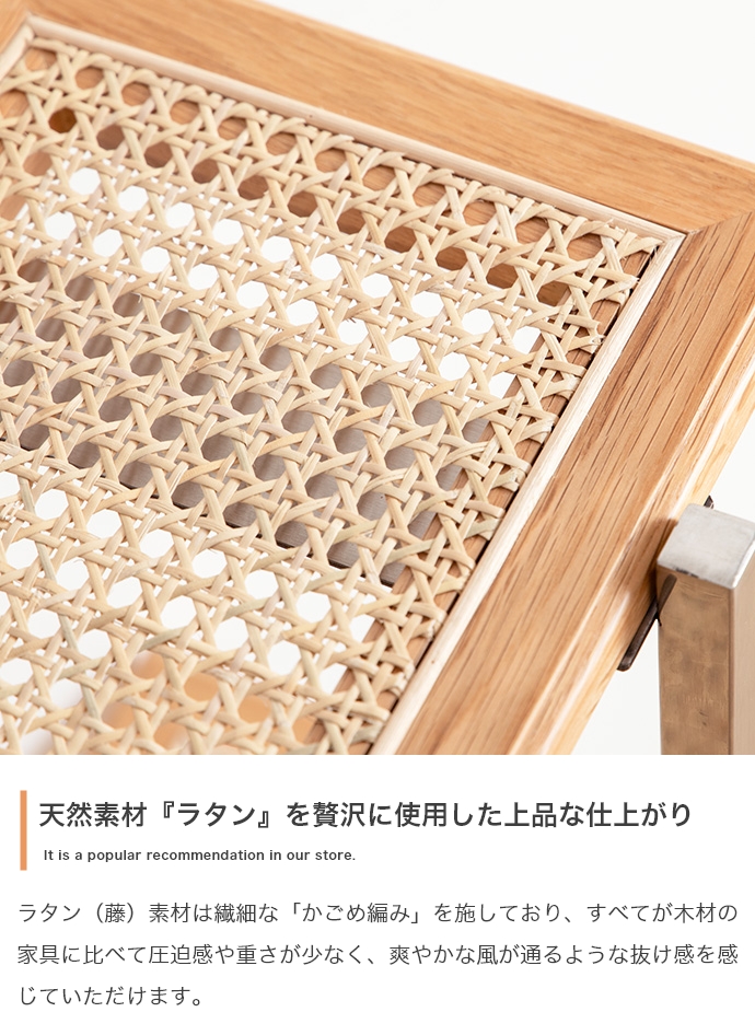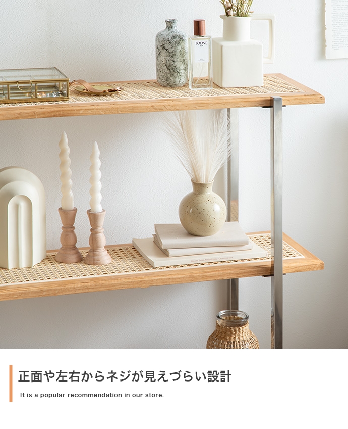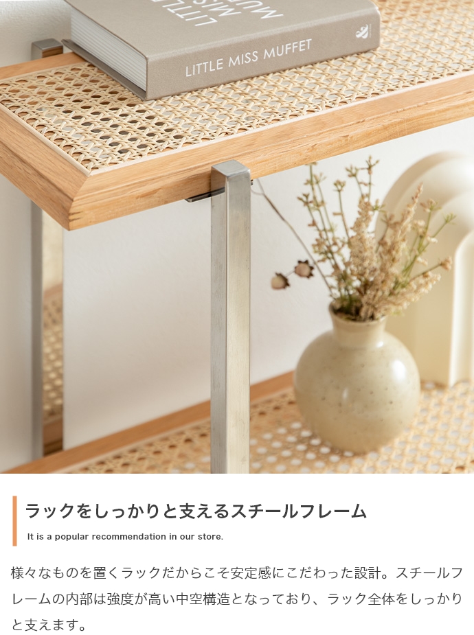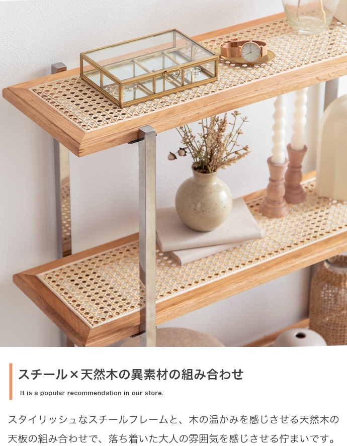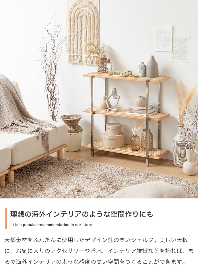 ナチュラルさの中に一味違う大人な印象を持つ、天然素材のラタンを用いた『Komero』3段シェルフ。天然素材『ラタン』と『オーク材』を贅沢に使用した上品な仕上がりで、ワンランク上のこなれ感ある雰囲気を演出することが可能です。また、置く場所を選ばないコンパクト設計なので、様々なお部屋に置くことが可能です。韓国インテリアに最適!