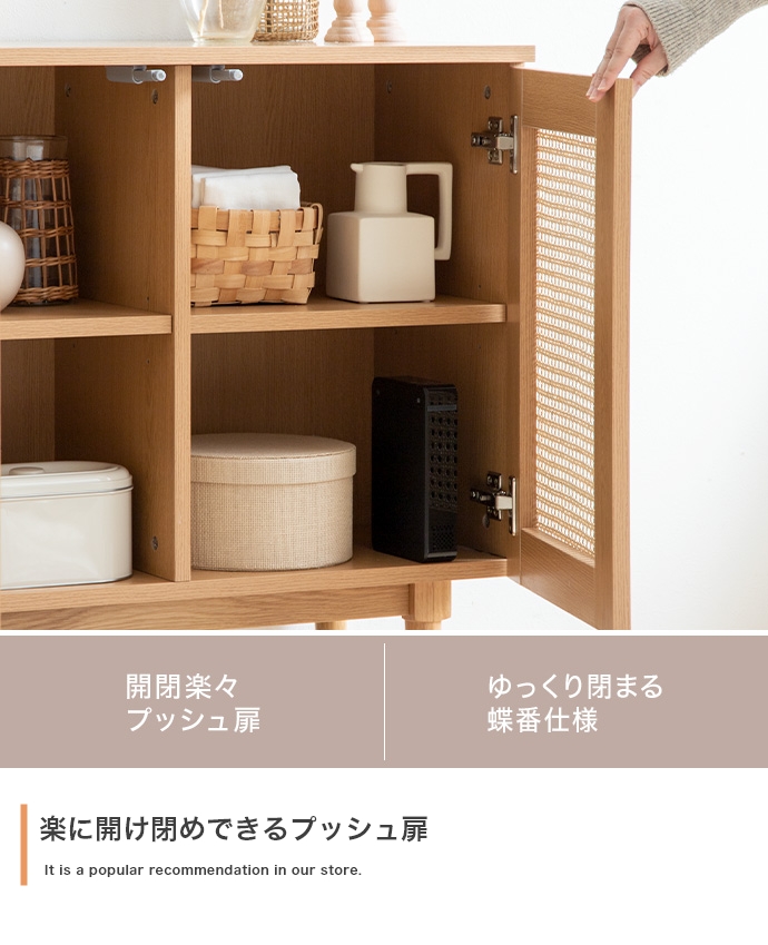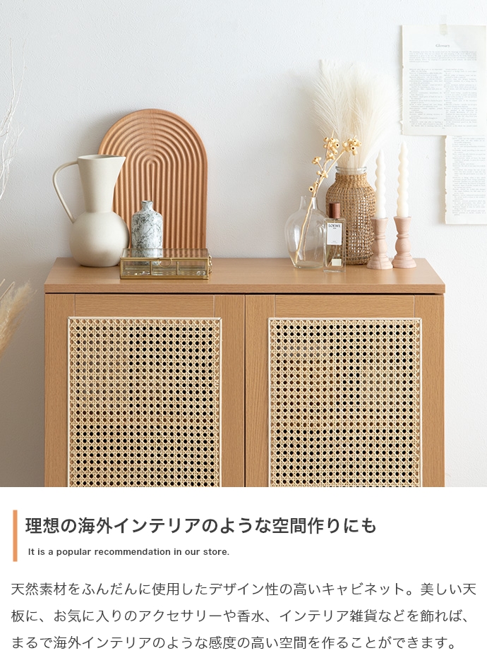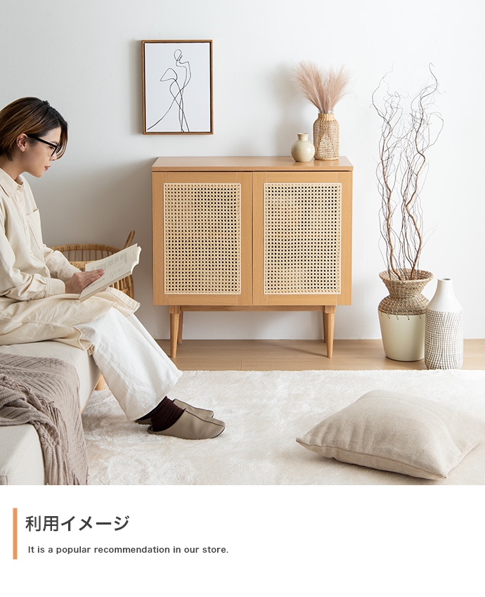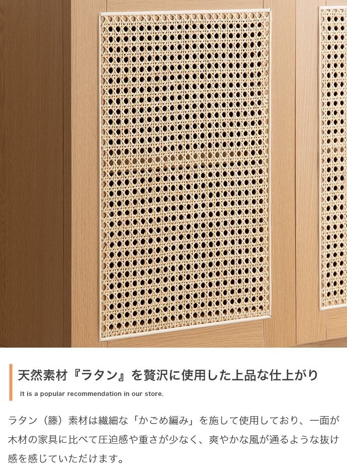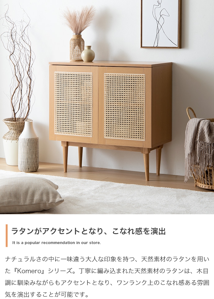 天然ラタンと美しい木目調を使用した、上質さ溢れる『Komero(コメロ)』ラタンキャビネット。扉には本物の籐(ラタン)を、本体にはリアルな木目調を施し、ナチュラル感溢れるデザインに仕上げました。また、圧迫感を与えない程よいサイズ感は、広いお部屋やワンルームなどお部屋の広さを選ばず置いていただけます。また、すっきりしたフォルムながらも、収納力も抜群。生活感溢れるごちゃつきがちな小物や、機械類なども隠して収納でき、お部屋をすっきり見せることが可能です。韓国インテリアに最適!
