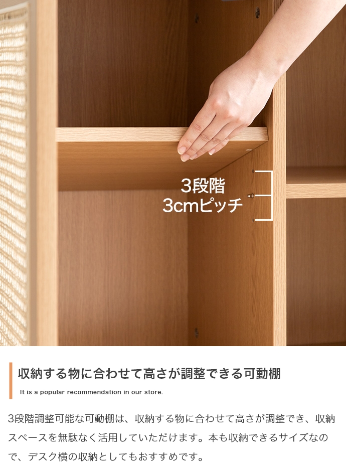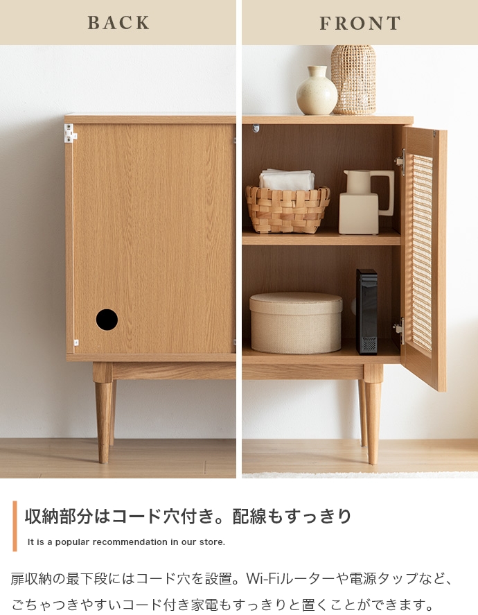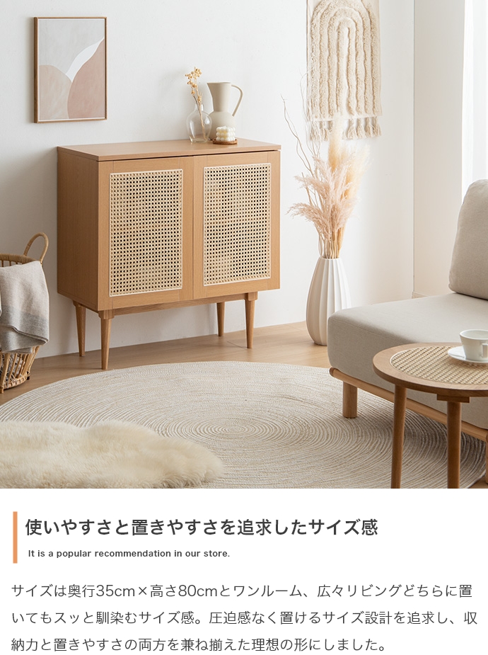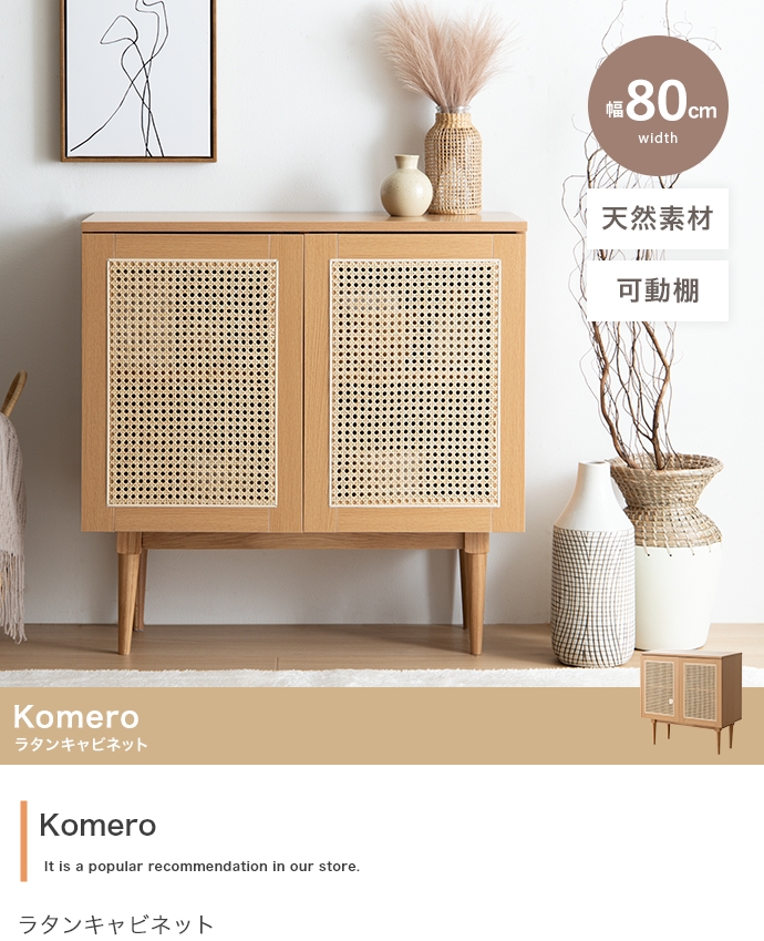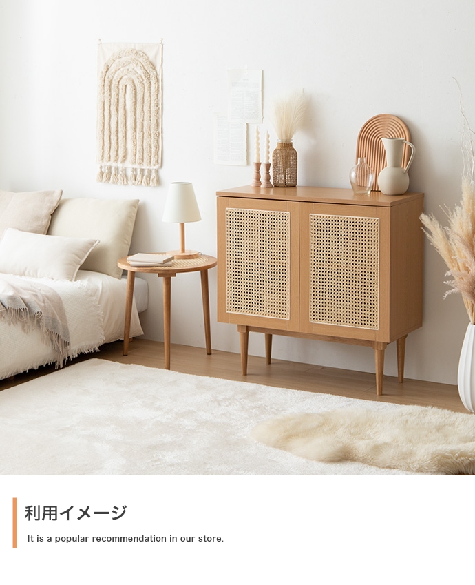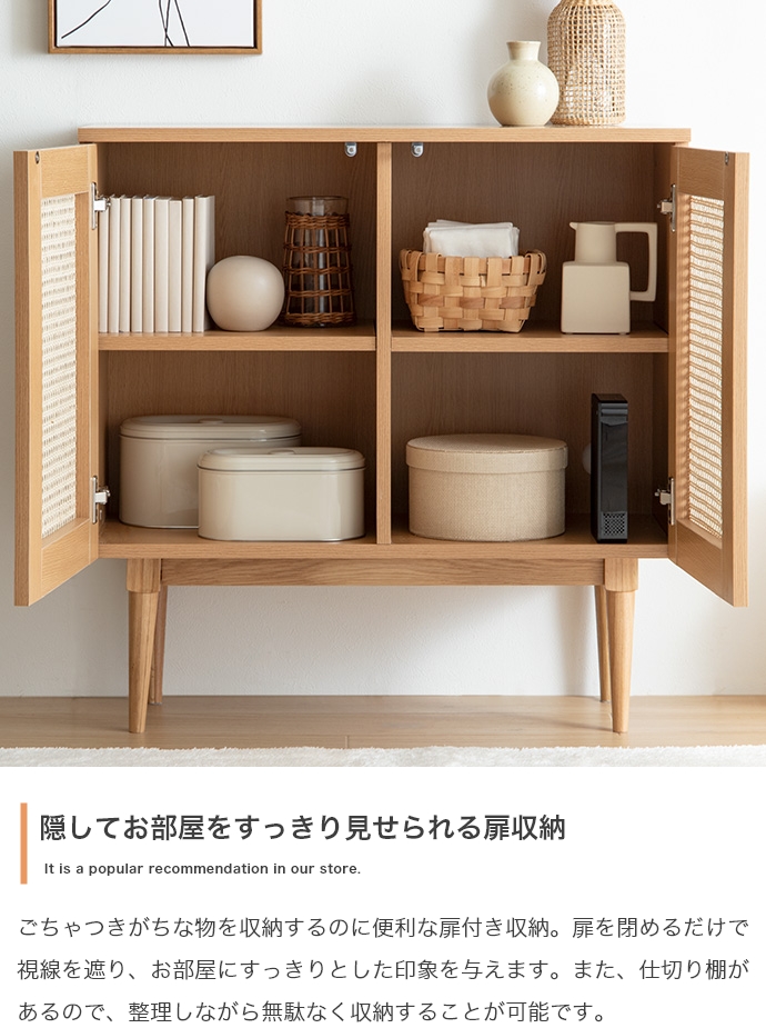 天然ラタンと美しい木目調を使用した、上質さ溢れる『Komero(コメロ)』ラタンキャビネット。扉には本物の籐(ラタン)を、本体にはリアルな木目調を施し、ナチュラル感溢れるデザインに仕上げました。また、圧迫感を与えない程よいサイズ感は、広いお部屋やワンルームなどお部屋の広さを選ばず置いていただけます。また、すっきりしたフォルムながらも、収納力も抜群。生活感溢れるごちゃつきがちな小物や、機械類なども隠して収納でき、お部屋をすっきり見せることが可能です。韓国インテリアに最適!