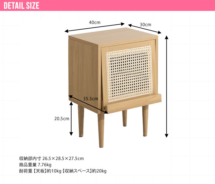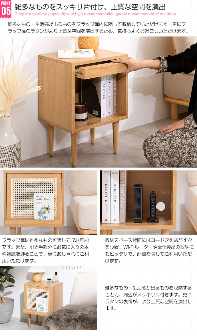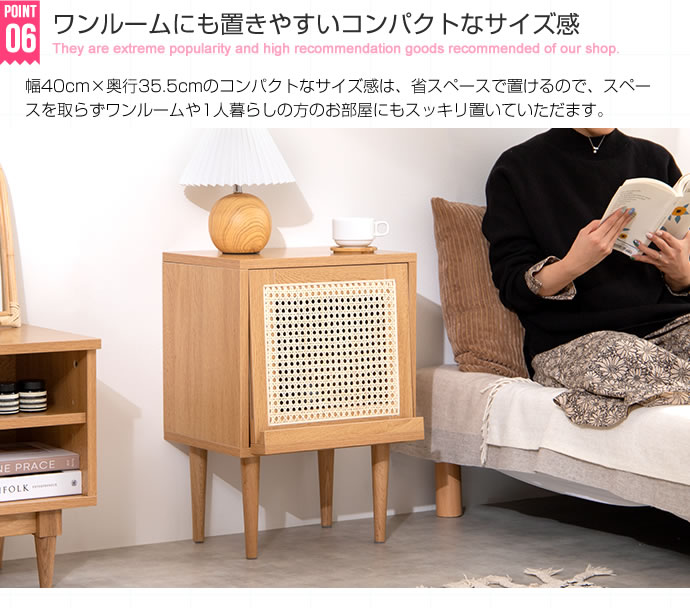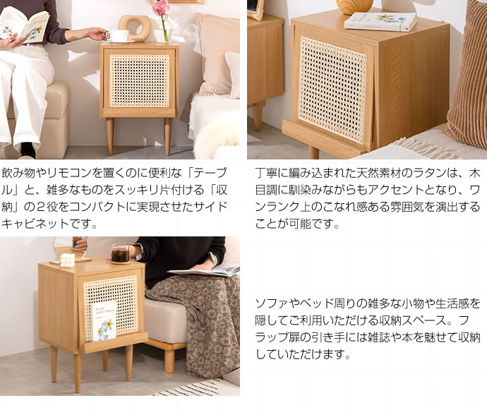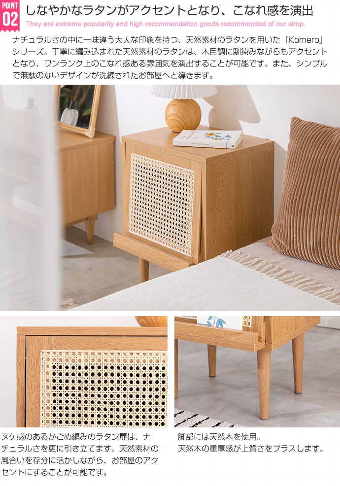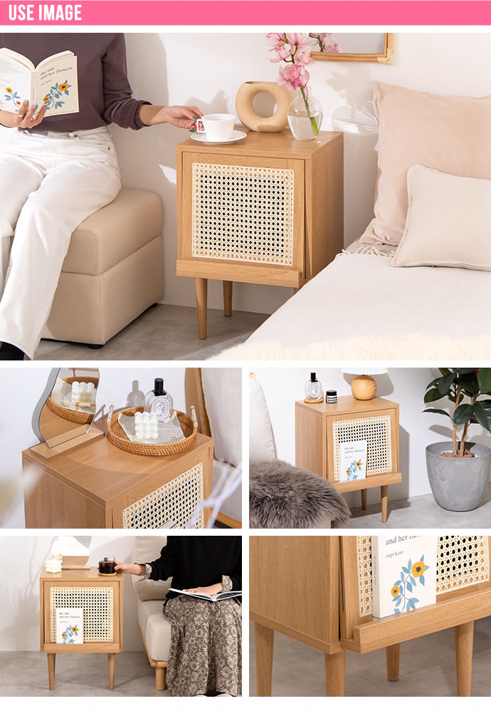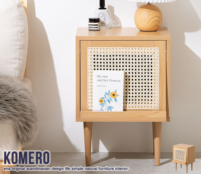 天然ラタンと美しい木目調を使用した、上質さ溢れる『Komero(コメロ)』ラタンサイドキャビネット。扉には本物の籐(ラタン)を、本体にはリアルな木目調を施し、ナチュラル感溢れるデザインに仕上げました。また、圧迫感を与えないコンパクトサイズながらも、収納力も抜群。生活感溢れるごちゃつきがちな小物や、機械類なども隠して収納でき、お部屋をすっきり見せることが可能です。韓国インテリアに最適!