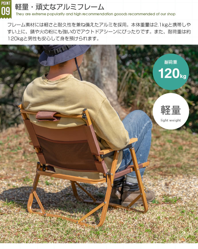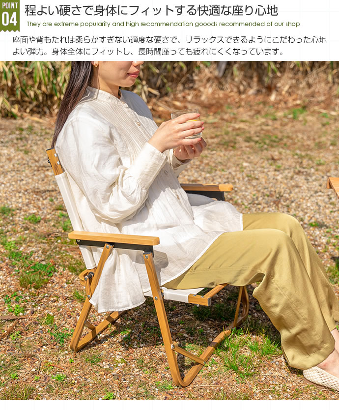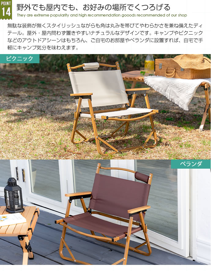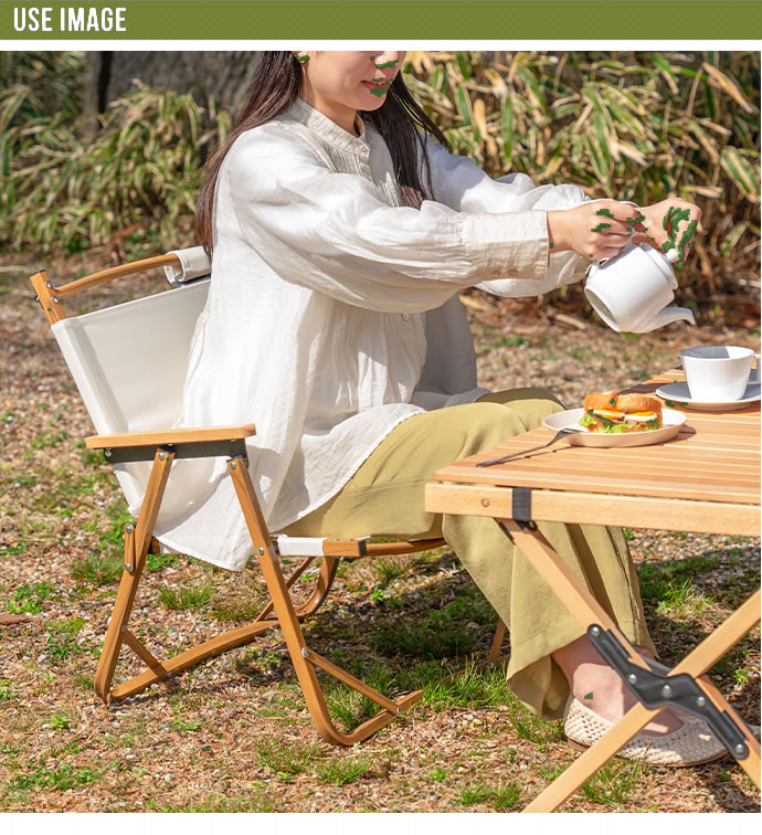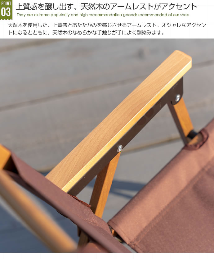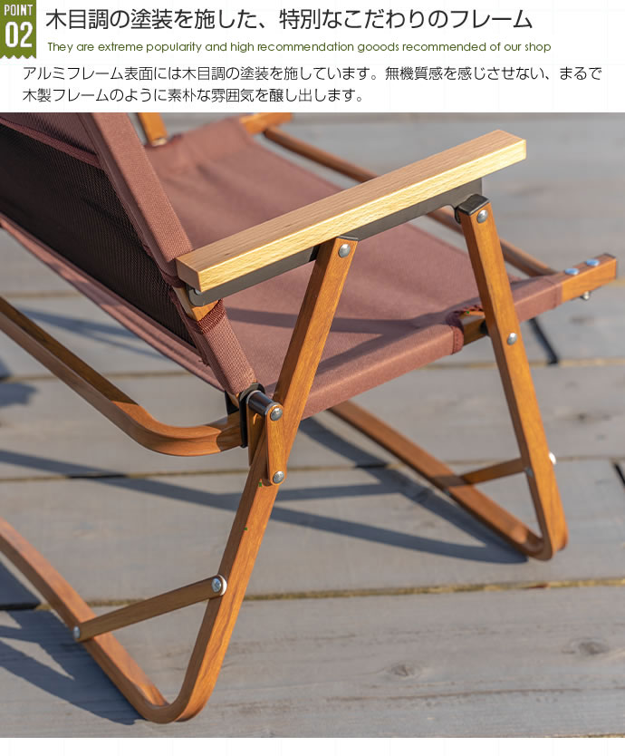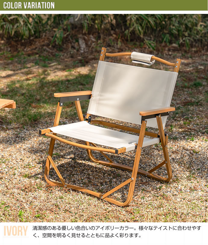 木目調のアルミフレームと天然木のアームレストがナチュラルな雰囲気を演出する、折りたたみアウトドア フォールディングチェア。さらりとした肌触りの座面と背もたれは、程良い硬さで体を包み込み、ゆったりと寛ぐことが出来ます。背面には雑誌や小物の収納に便利なメッシュポケット付きです。アルミフレーム表面には木目調の塗装を施しています。無機質感を感じさせない、まるで木製フレームのように素朴な雰囲気を醸し出します。アームレストは天然木を使用しているので上質感と温かみを感じさせます。完成品なので、面倒な組立は一切不要。持ち運びに便利な収納バック付き。屋外・室内問わずに置きやすいナチュラルなデザインです。アウトドアシーンはもちろん、自宅でも手軽にキャンプ気分を味わえます。