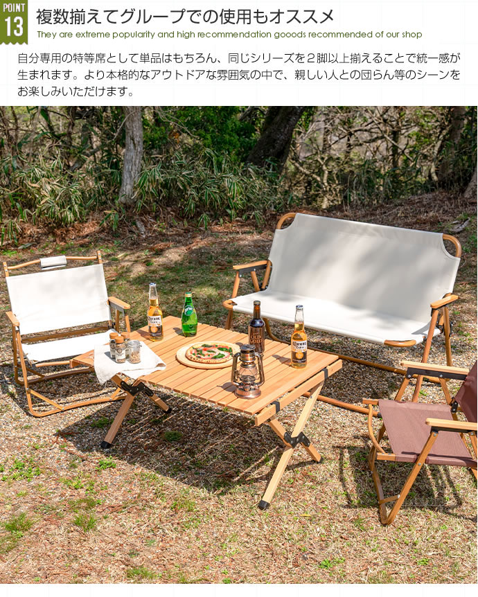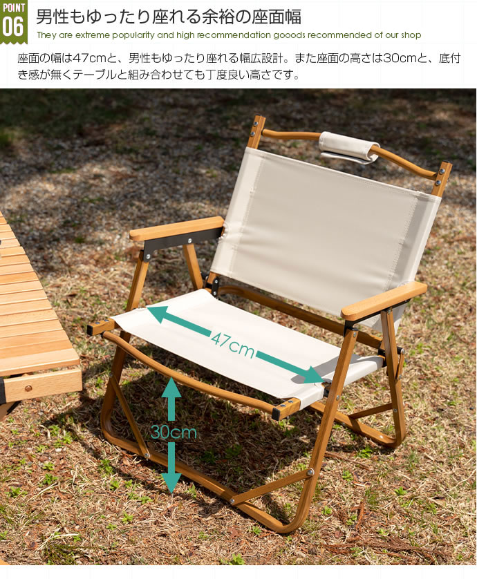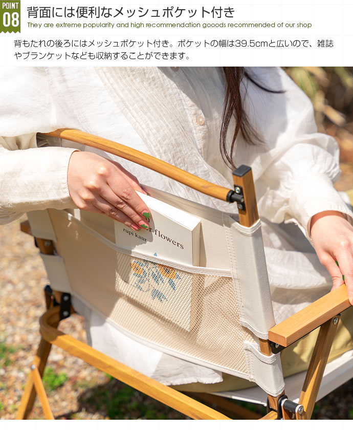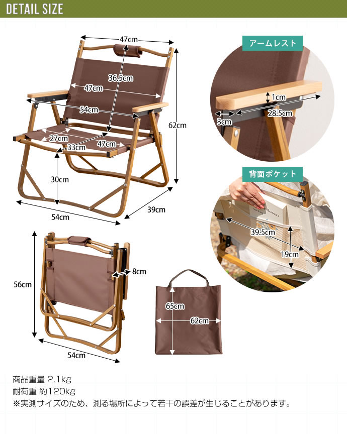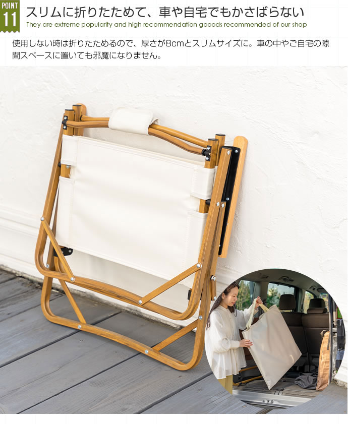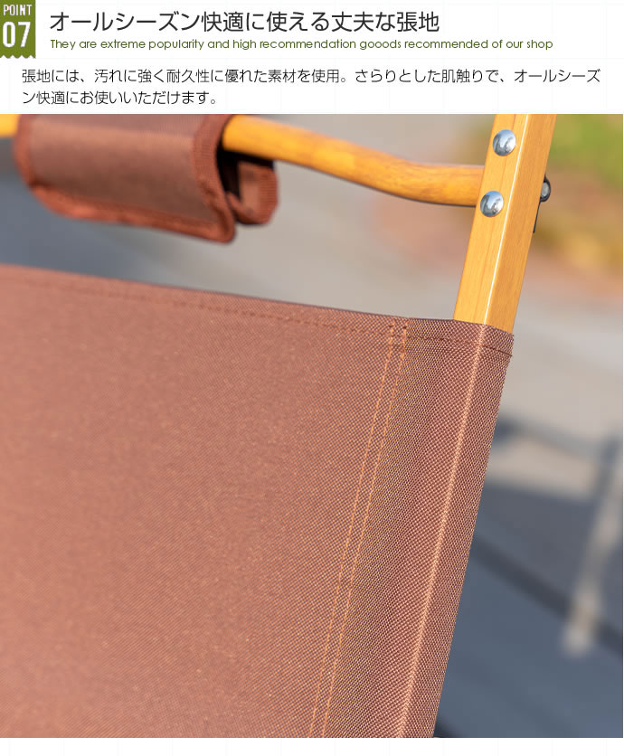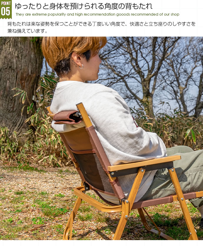 木目調のアルミフレームと天然木のアームレストがナチュラルな雰囲気を演出する、折りたたみアウトドア フォールディングチェア。さらりとした肌触りの座面と背もたれは、程良い硬さで体を包み込み、ゆったりと寛ぐことが出来ます。背面には雑誌や小物の収納に便利なメッシュポケット付きです。アルミフレーム表面には木目調の塗装を施しています。無機質感を感じさせない、まるで木製フレームのように素朴な雰囲気を醸し出します。アームレストは天然木を使用しているので上質感と温かみを感じさせます。完成品なので、面倒な組立は一切不要。持ち運びに便利な収納バック付き。屋外・室内問わずに置きやすいナチュラルなデザインです。アウトドアシーンはもちろん、自宅でも手軽にキャンプ気分を味わえます。
