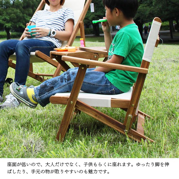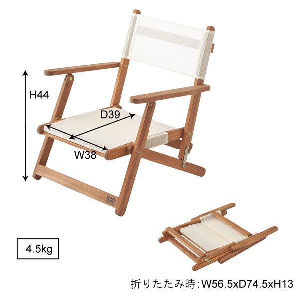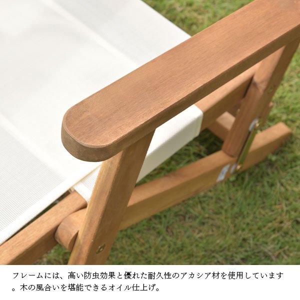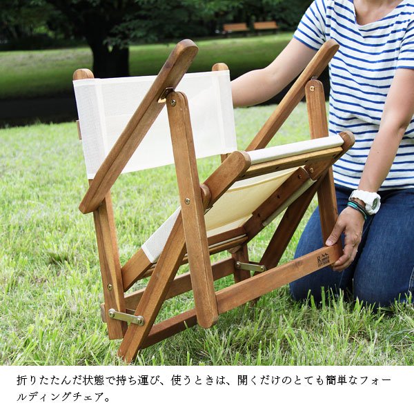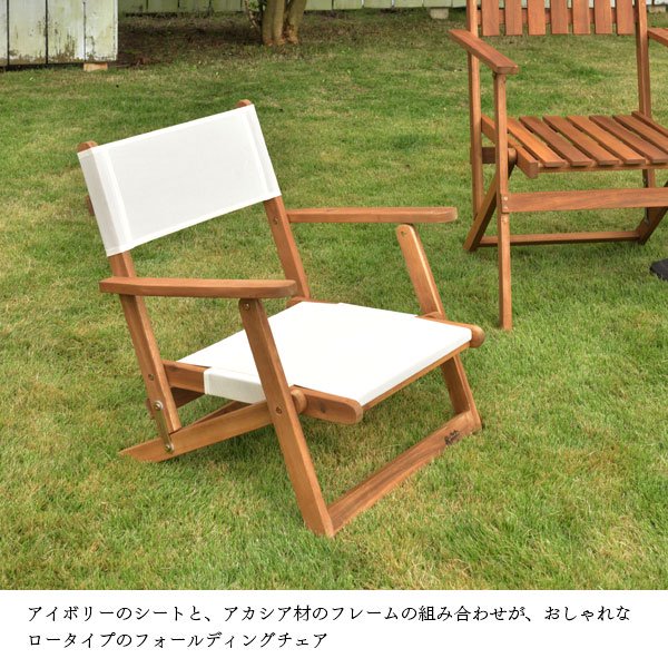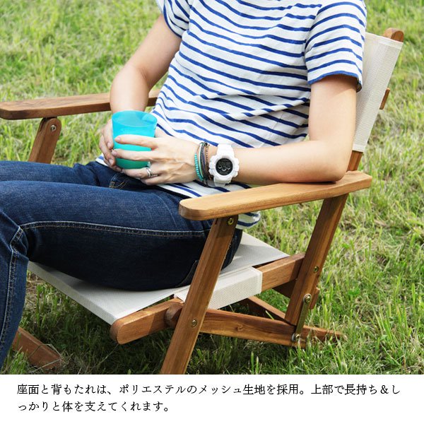 アイボリーのシートと、アカシア材のフレームの組み合わせが、おしゃれなロータイプのフォールディングチェア。座面が低いので、大人だけでなく、子供もらくに座れます。ゆったり脚を伸ばしたり、手元の物が取りやすいのも魅力です。座面と背もたれは、ポリエステルのメッシュ生地を採用。上部で長持ち&しっかりと体を支えてくれます。フレームには、高い防虫効果と優れた耐久性のアカシア材を使用しています。木の風合いを堪能できるオイル仕上げ。折りたたんだ状態で持ち運び、使うときは、開くだけのとても簡単なフォールディングチェア。