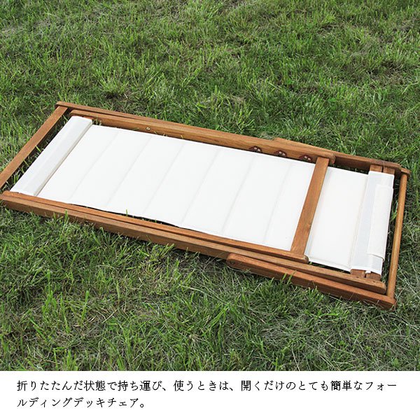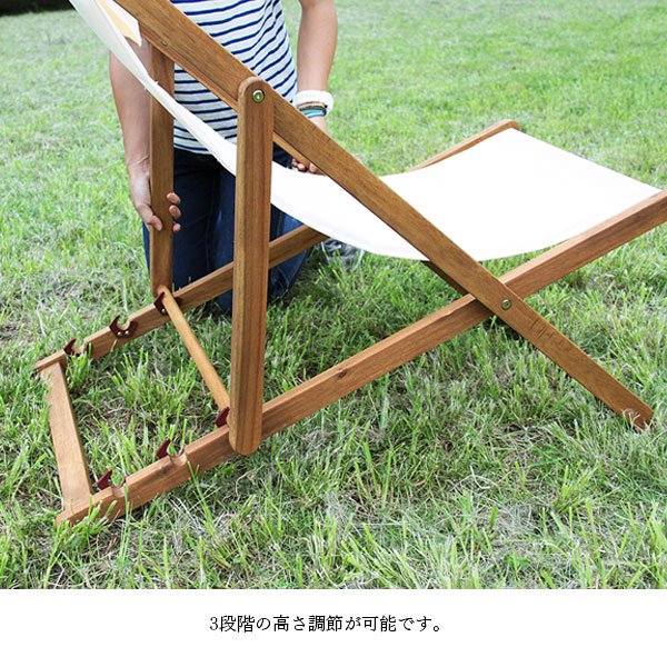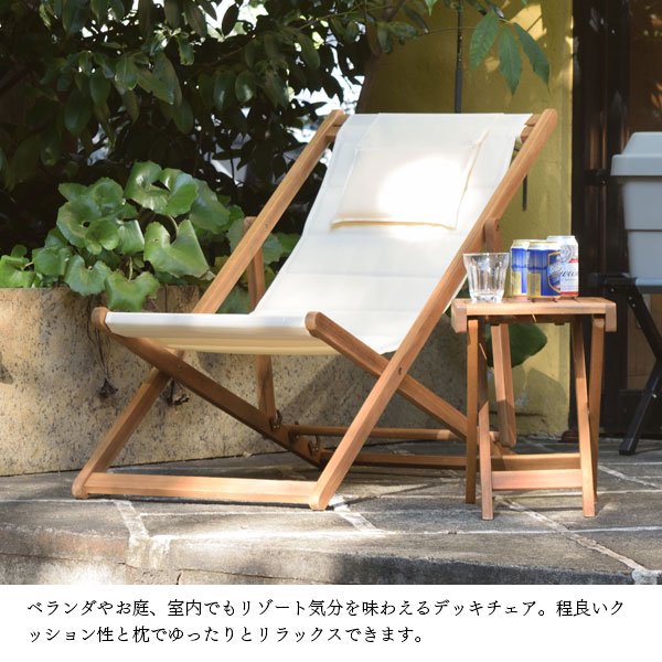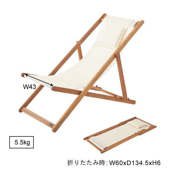 アイボリーのシートと、アカシア材のフレームの組み合わせが、おしゃれなデッキチェア。座面と背もたれは、ポリエステルのメッシュ生地を採用。丈夫で長持ち&しっかりと体を支えてくれます。フレームには、高い防虫効果と優れた耐久性のアカシア材を使用しています。木の風合いを堪能できるオイル仕上げ。