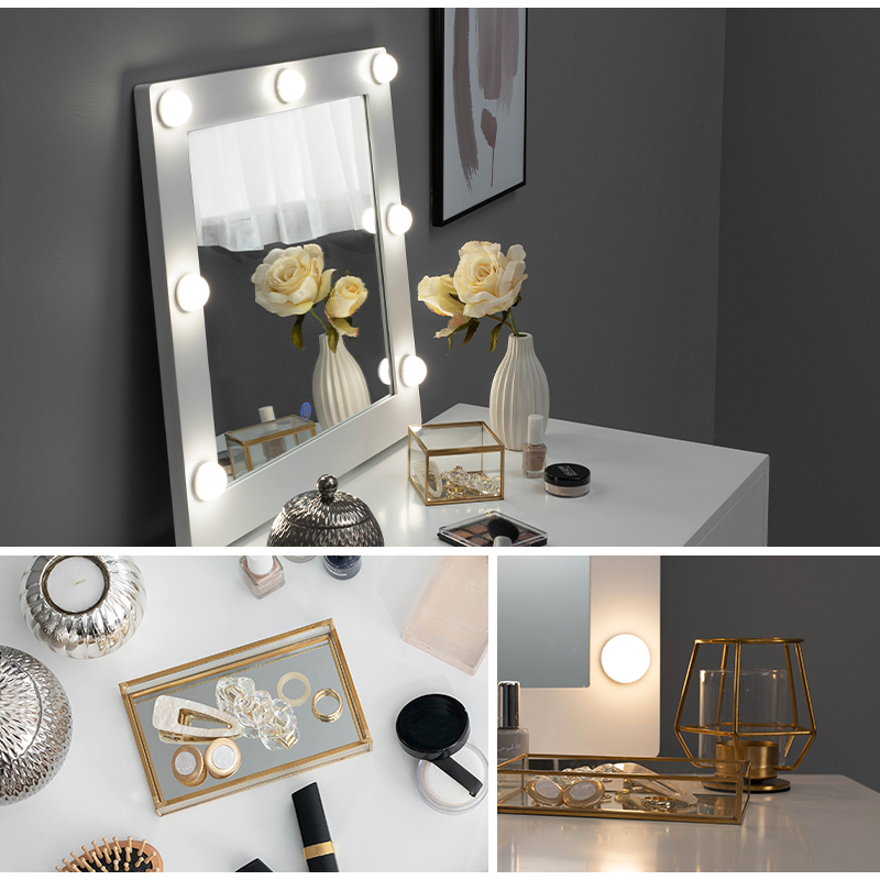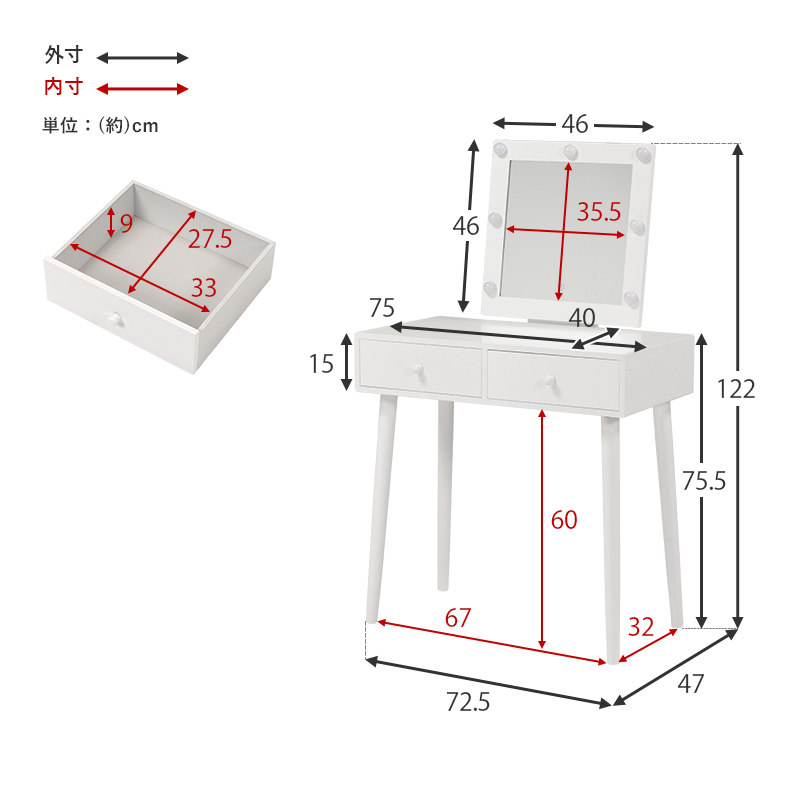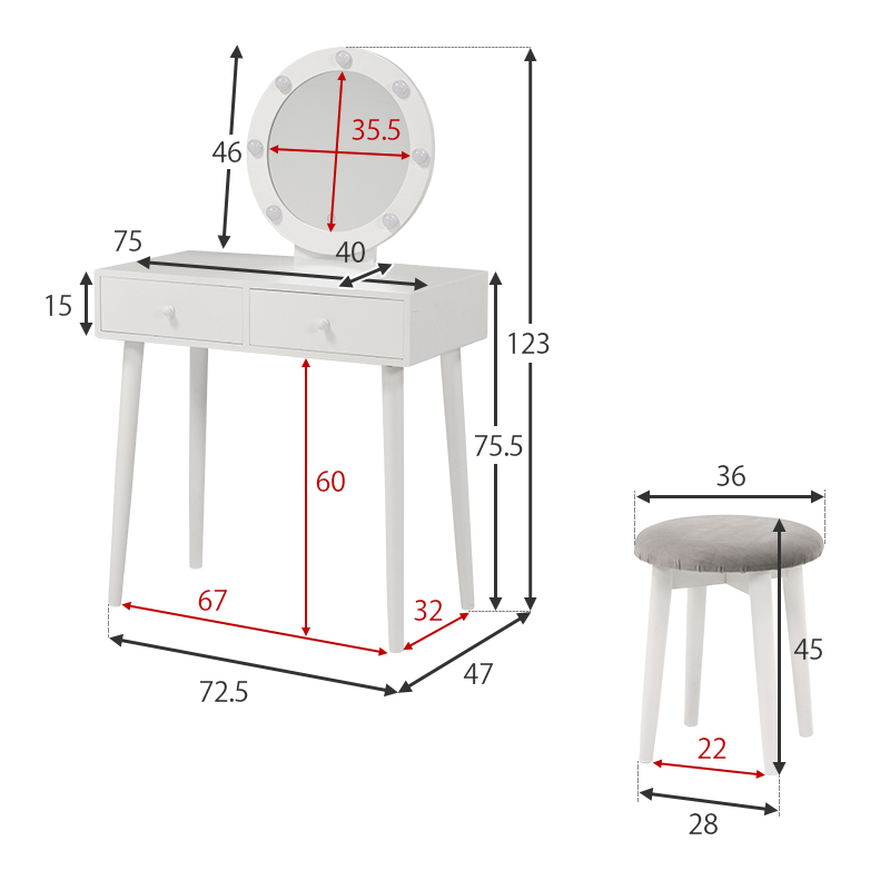 LEDの女優ライト付きのドレッサー。使う人を選ばないシンプルなデザインで、ベロア調クッションのスツール付。