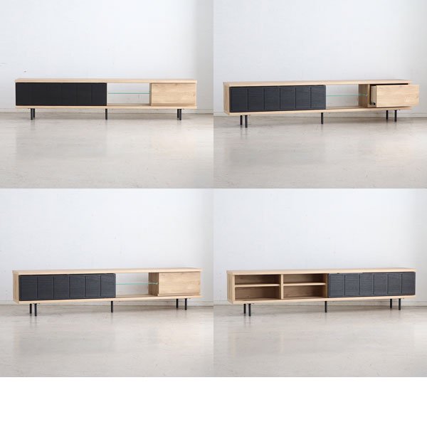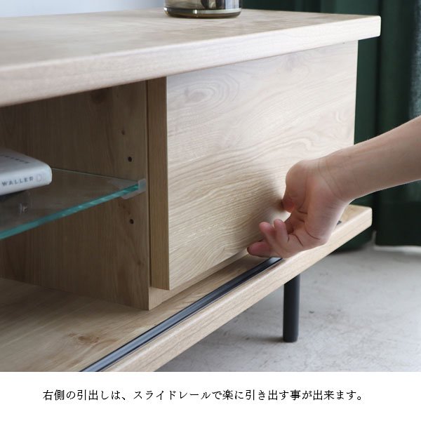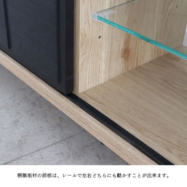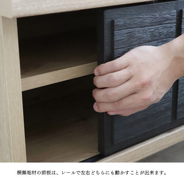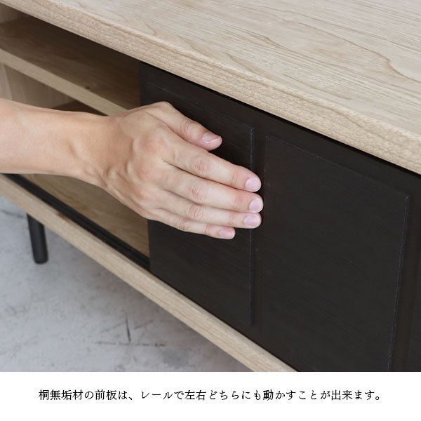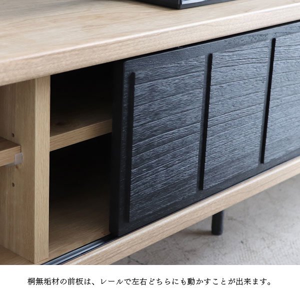 軽さと調湿性をもった桐無垢材をふんだんに使ったテレビボード。圧迫感をなくすため、通常の奥行きよりも少し薄くなっております。奥行きサイズと桐材を用いることで軽量で扱いやすい商品となております。黒とナチュラルのコントラストが高級感を醸し出してくれます。