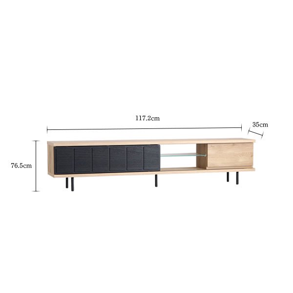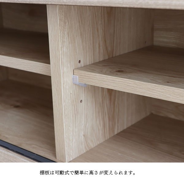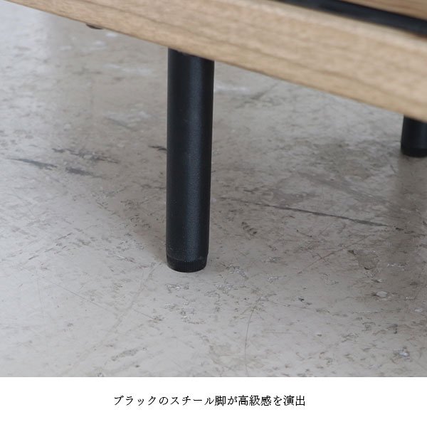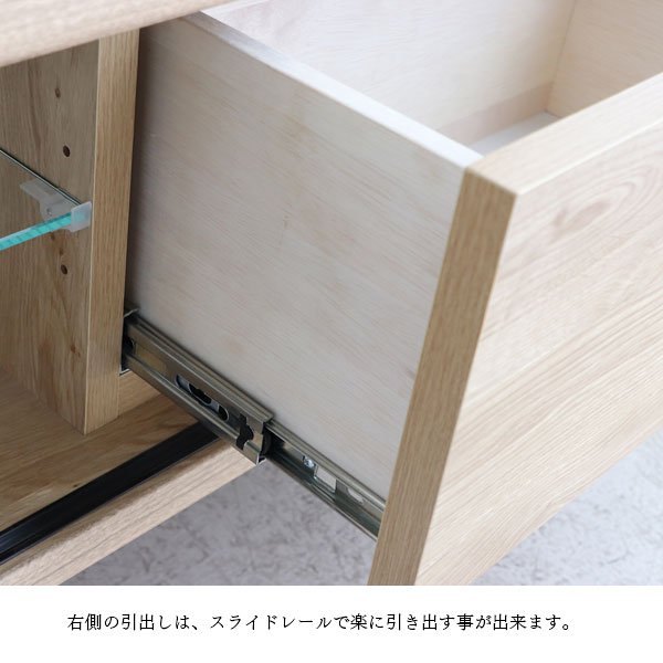 天板:オレフィン化粧板 / 本体:プリント化粧板 / 前板:桐無垢(ウレタン塗装)/ 棚:非強化6mm透明ガラス / 脚:スチール(粉体塗装)