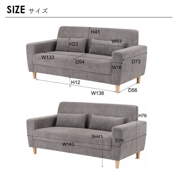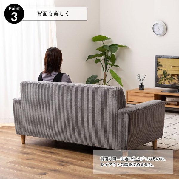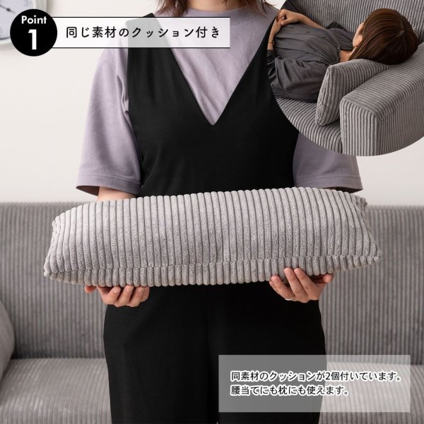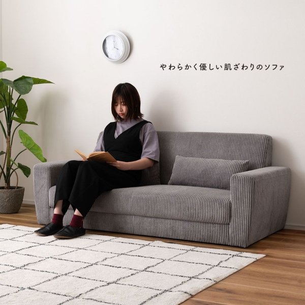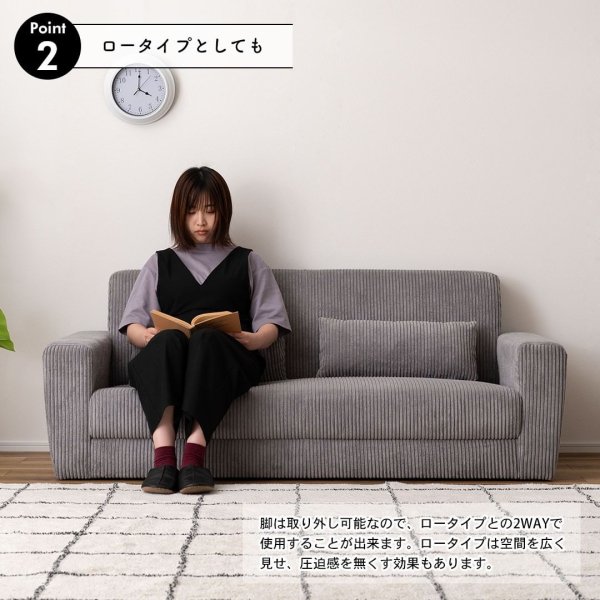 やわらかく優しい肌触りのソファ。ボリューム感を感じさせるコーデュロイ生地がゆったりした優しい空間を演出します。脚を取り外して、ローソファーとしてもお使いいただけます。