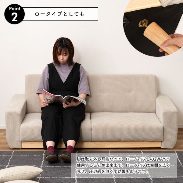 コーデュロイ×天然木がお部屋にあたたかみを与えてくれるソファ。ナチュラルで優しい印象のソファ"メゾン"。コーデュロイの質感と天然木の木製フレームがあたたかみのある空間を演出してくれます。脚は取り外してロータイプとして使用する事も可能なので、用途や雰囲気に合わせて2WAYで楽しむことが出来ます。