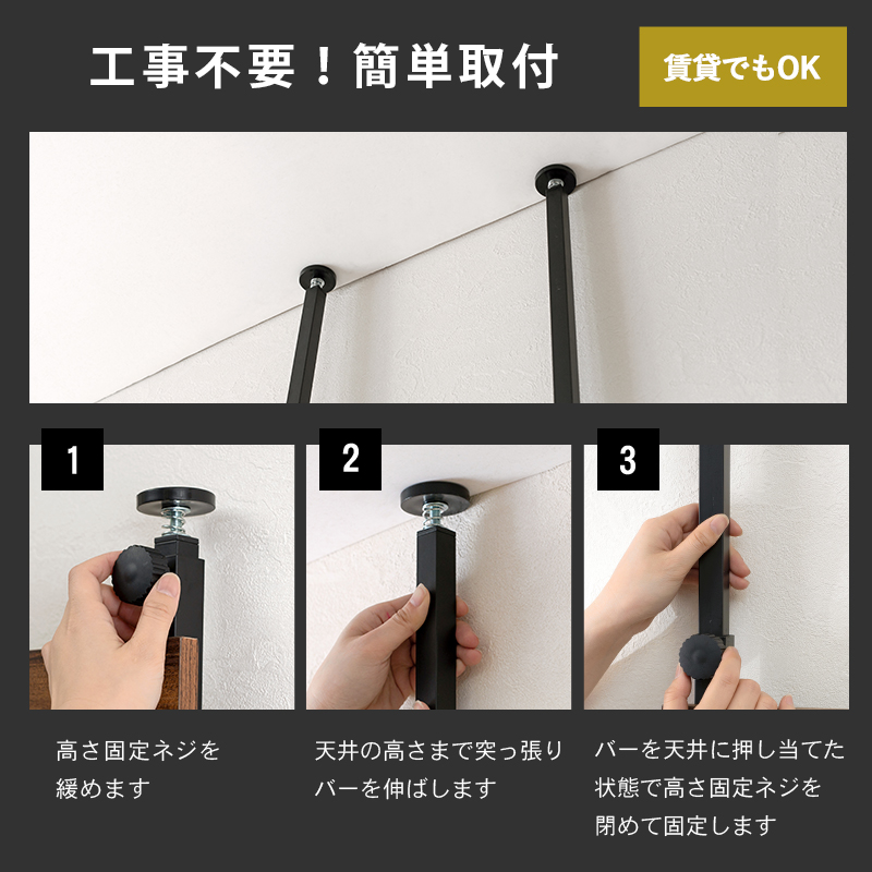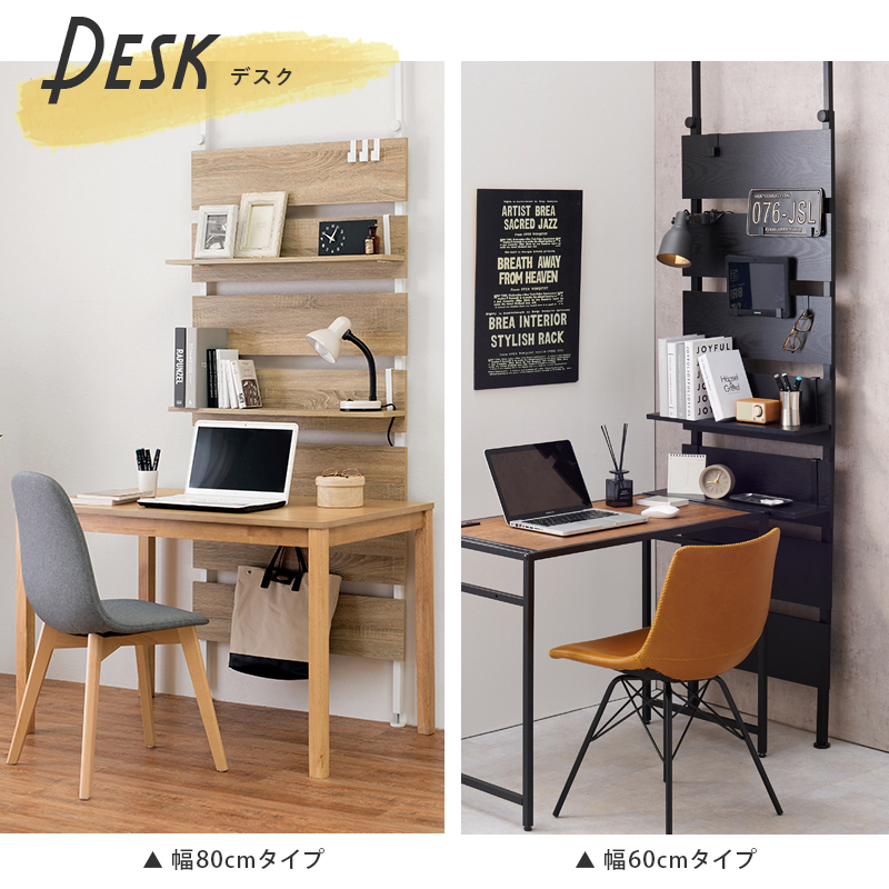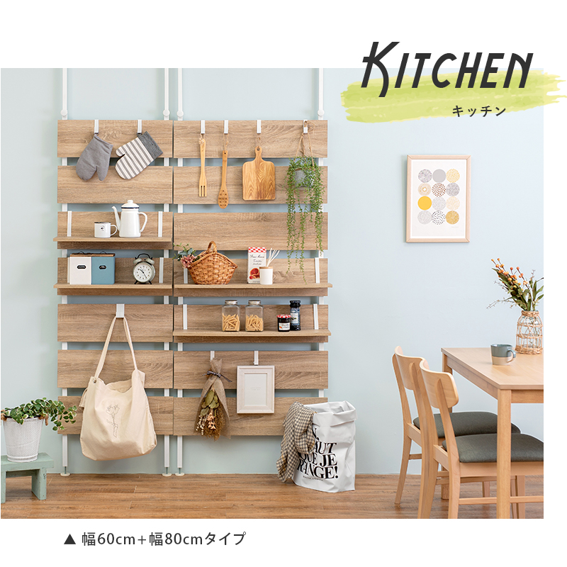 お部屋のいろいろな場所に設置できる突っ張り式ラック。パーテーションや間仕切りとしても活躍します。幅60cmタイプ