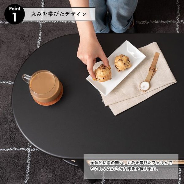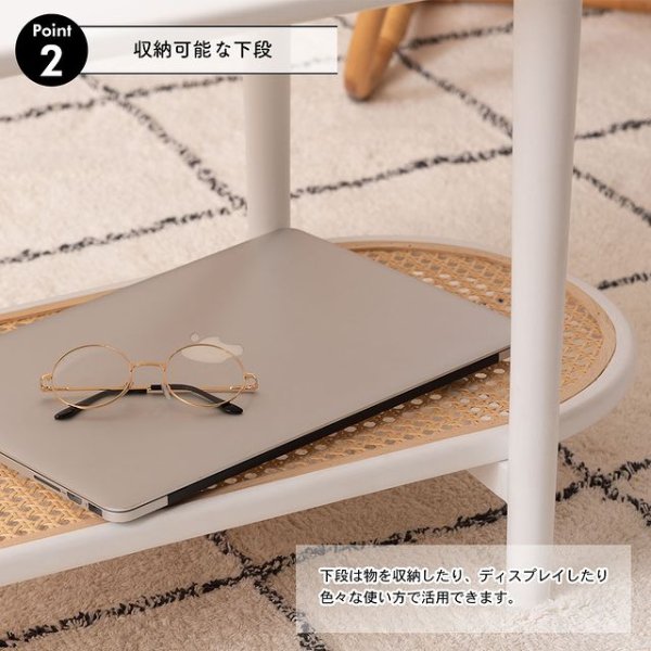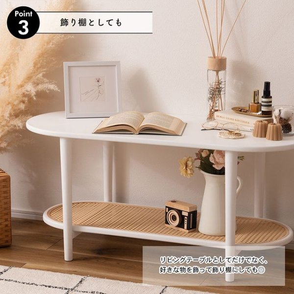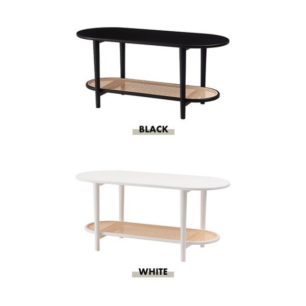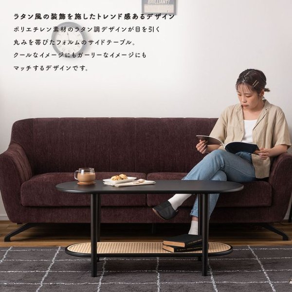 ラタン風の装飾を施したトレンド感あるデザインのリビングテーブル ポリエチレン素材のラタン調デザインが目を引く丸みを帯びたフォルムの テーブルは、韓国インテリアや、クールなイメージにもガーリーなイメージにもマッチするデザイン。 シリーズ合わせて使用すればお部屋のまとまり感もUPします。
