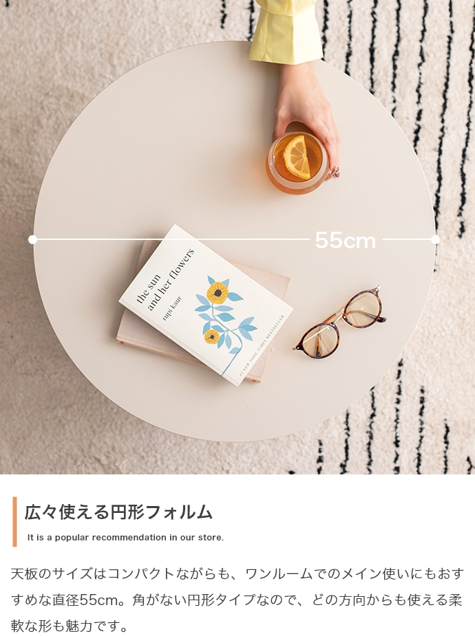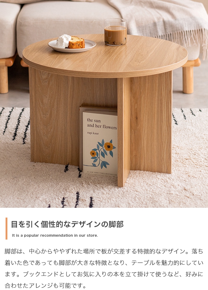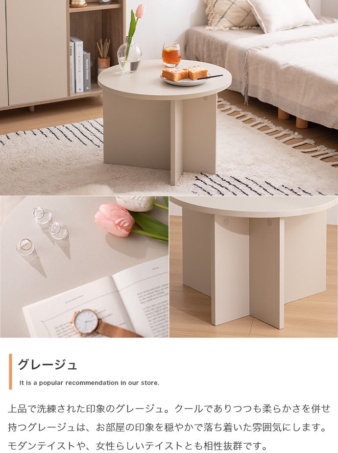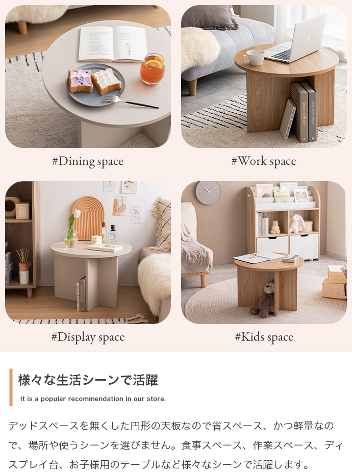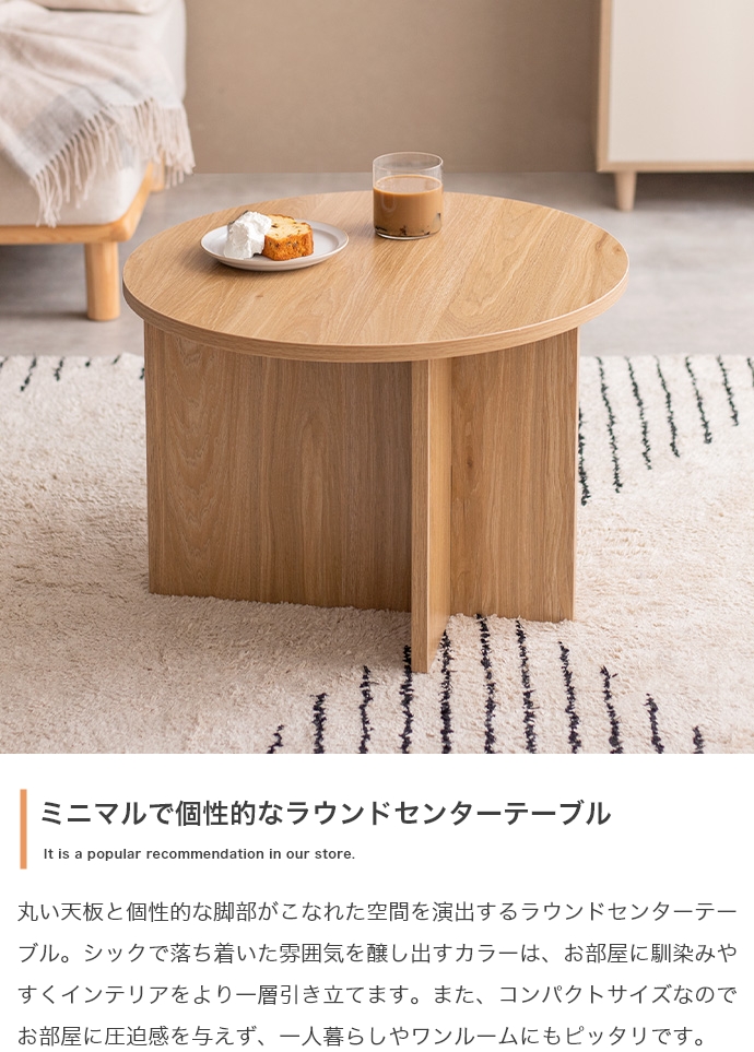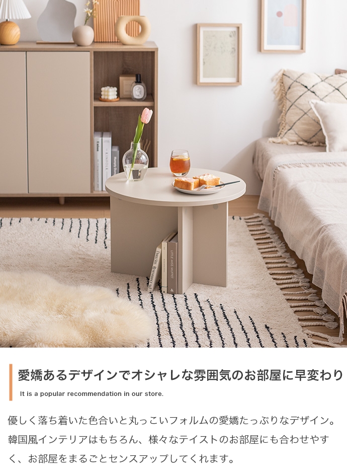 丸い天板と個性的な脚部がこなれた空間を演出する『Luna(ルナ)』ラウンドセンターテーブル。優しく落ち着いた色合いと、丸いフォルムの愛嬌たっぷりなディテールは、韓国風インテリアはもちろん様々なテイストのお部屋にも馴染みます。省スペースながらも、ワンルームでのメイン使いにおすすめなサイズ感で、一人暮らしやワンルームの方にもおすすめです。