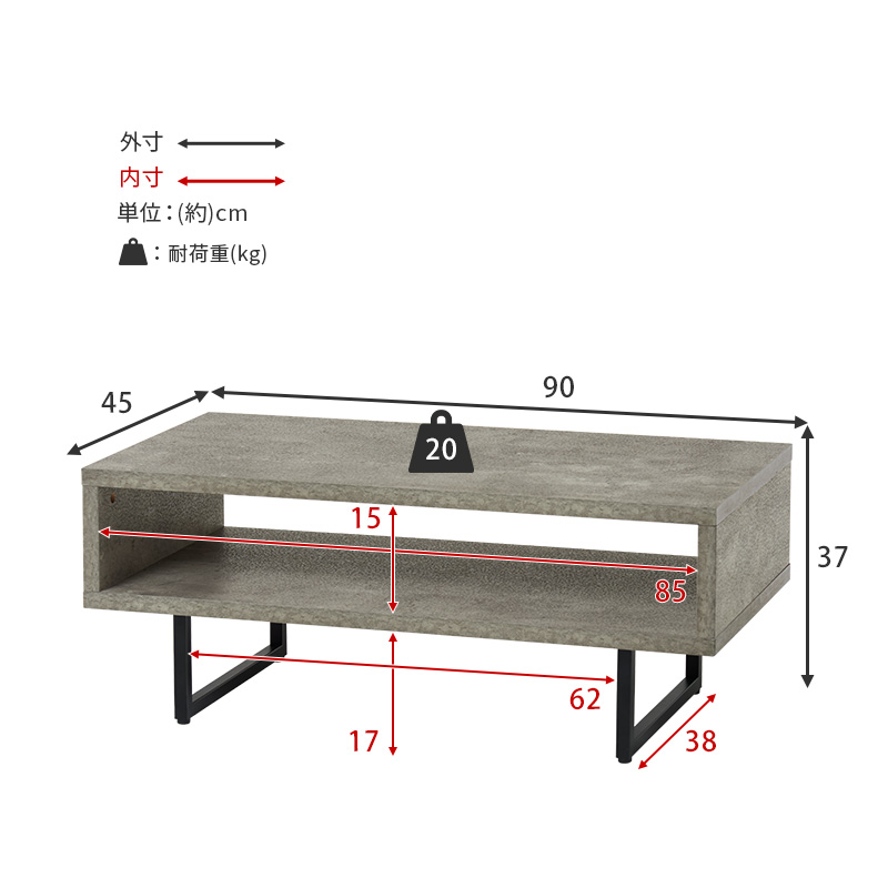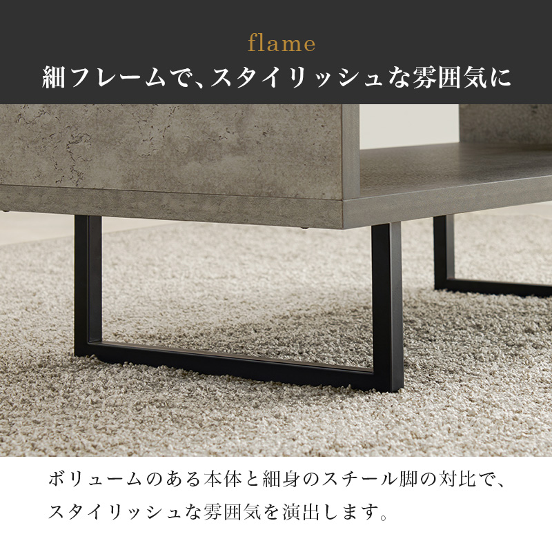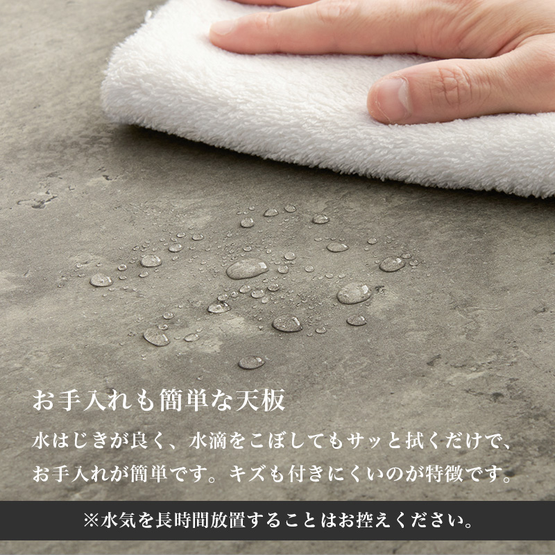 存在感のあるコンクリート柄の天板にスチール脚を合わせたデザイン。リアルなコンクリート柄に仕上げた天板。厚みもあり、しっかりとした丈夫さもあるので安心して使えます。水はじきが良く、水滴をこぼしてもサッと拭くだけで、お手入れが簡単です。キズもつきにくいのが特徴です。ボリュームのある本体と細身のスチール脚との対比で、スタイリッシュな雰囲気を演出します。必要なものをサッと取り出せるオープンタイプ。