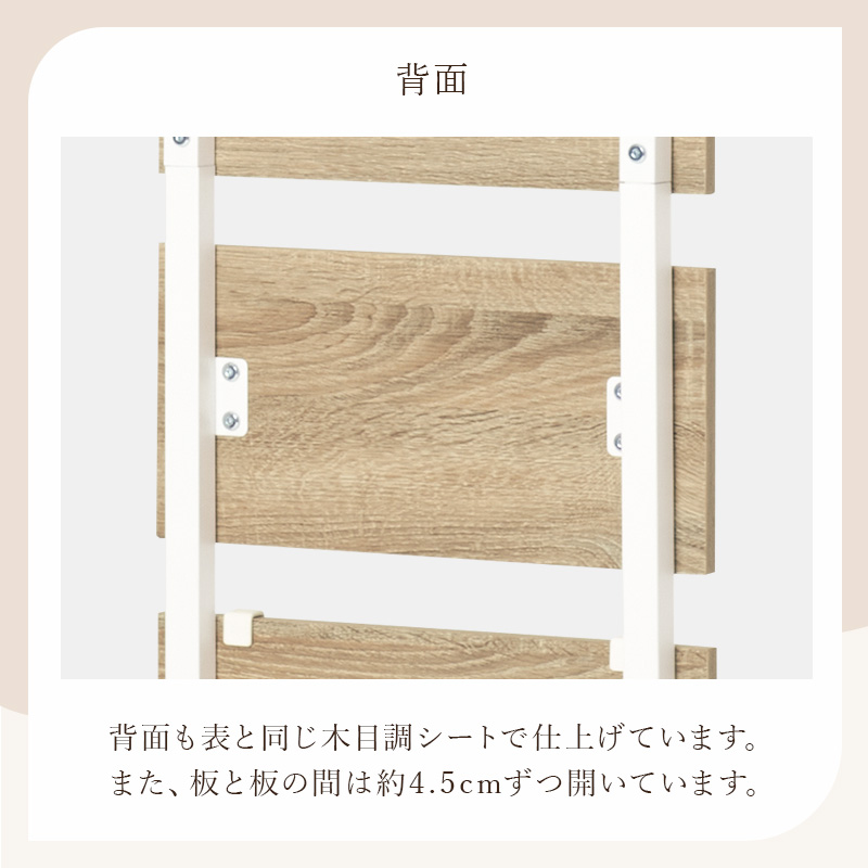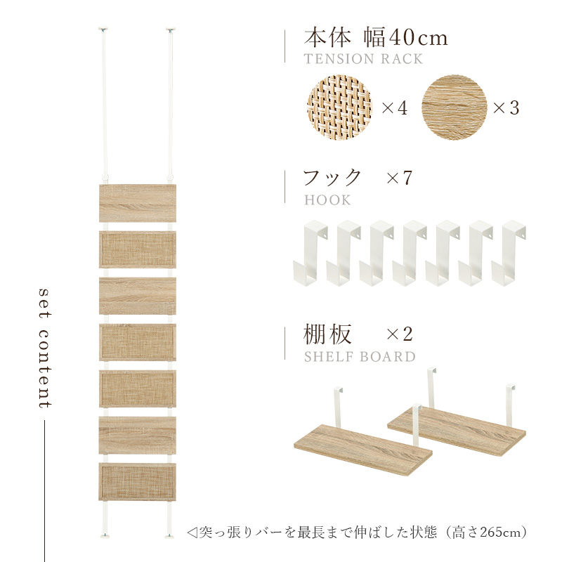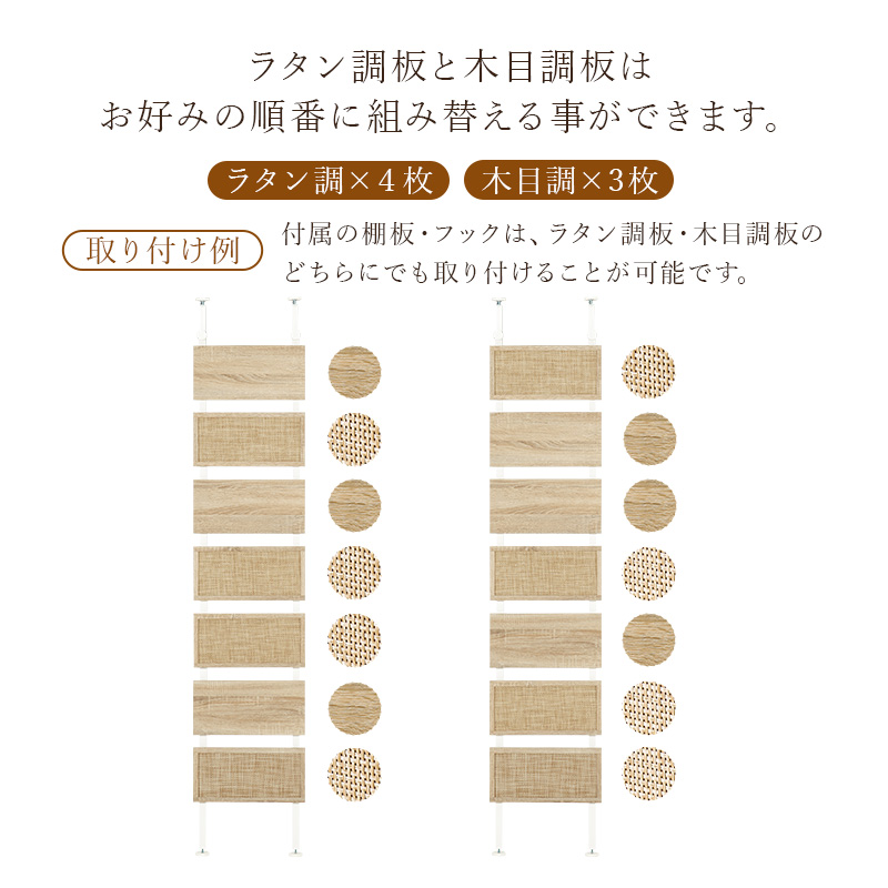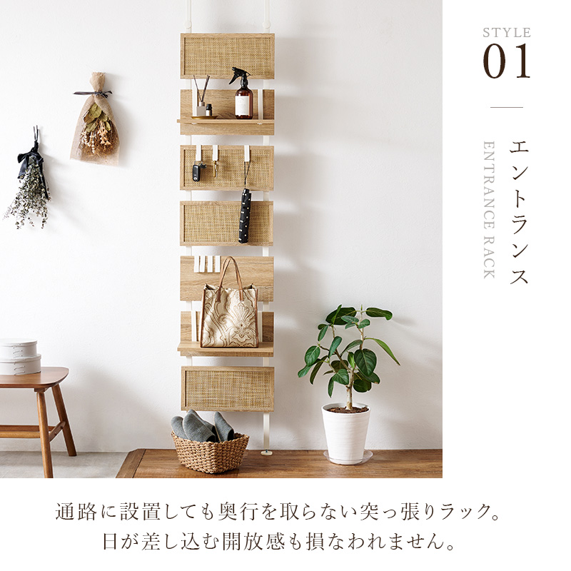 ナチュラルのラタン調ボードがおしゃれなアクセントに。お部屋のいろいろな場所に設置できる突っ張り式ラック。パーテーションや間仕切りとしても活躍します。幅40cmタイプ