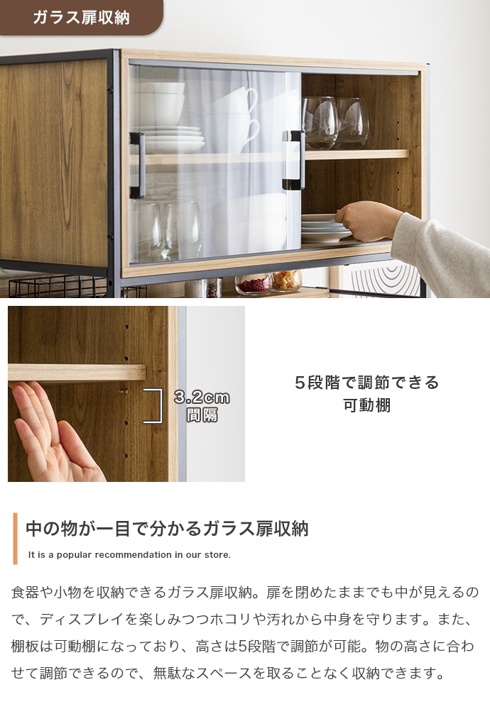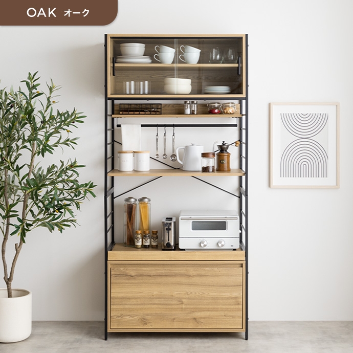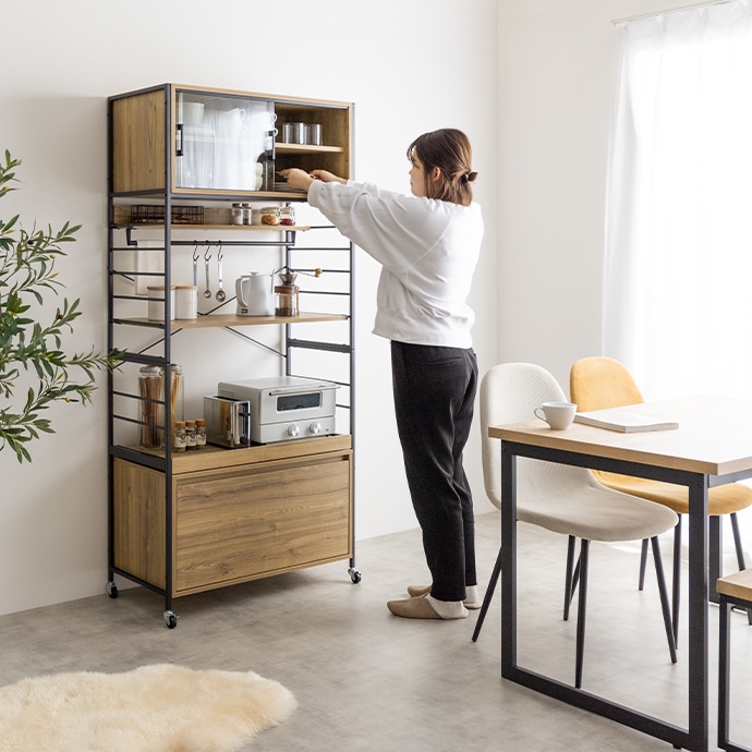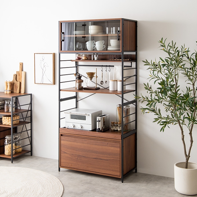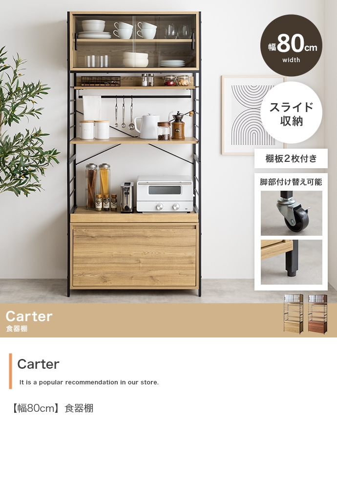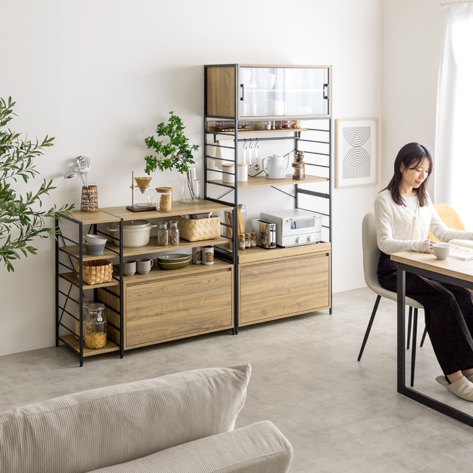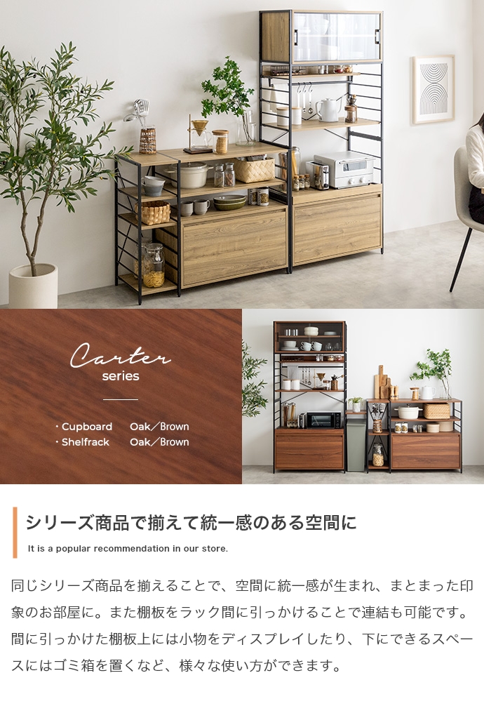 ヴィンテージ感漂う『Carter(カーター)』シリーズの食器棚。美しい木目×スチールの脚が大人の落ち着いた空間を演出します。5種類の収納スペースにより、キッチンに不可欠な家電や雑貨・食器等をまとめて1台に収納可能。オープンスペースの収納が多いので、物の出し入れがしやすく家事を快適に。お気に入りをディスプレイすることで見栄えの良い美しいキッチンが実現できます。
