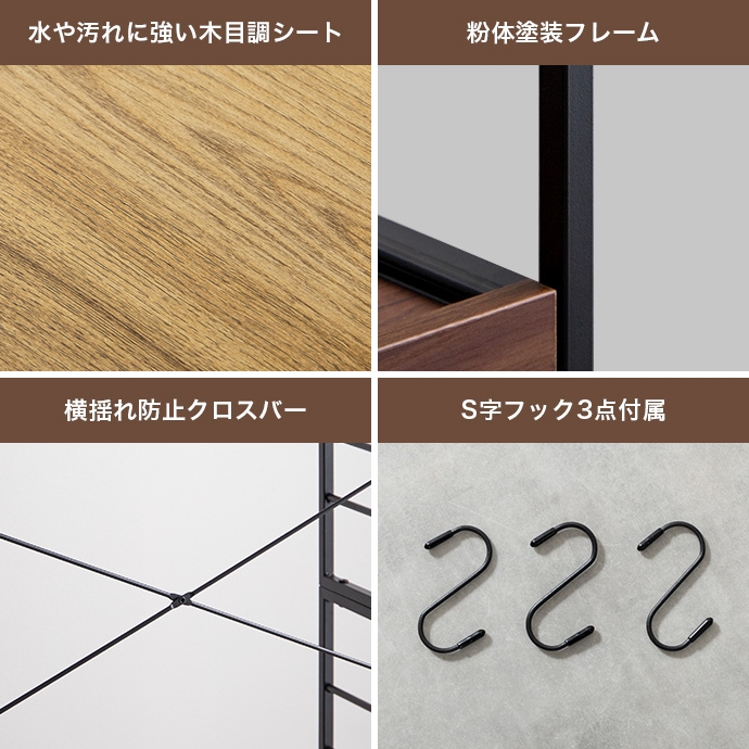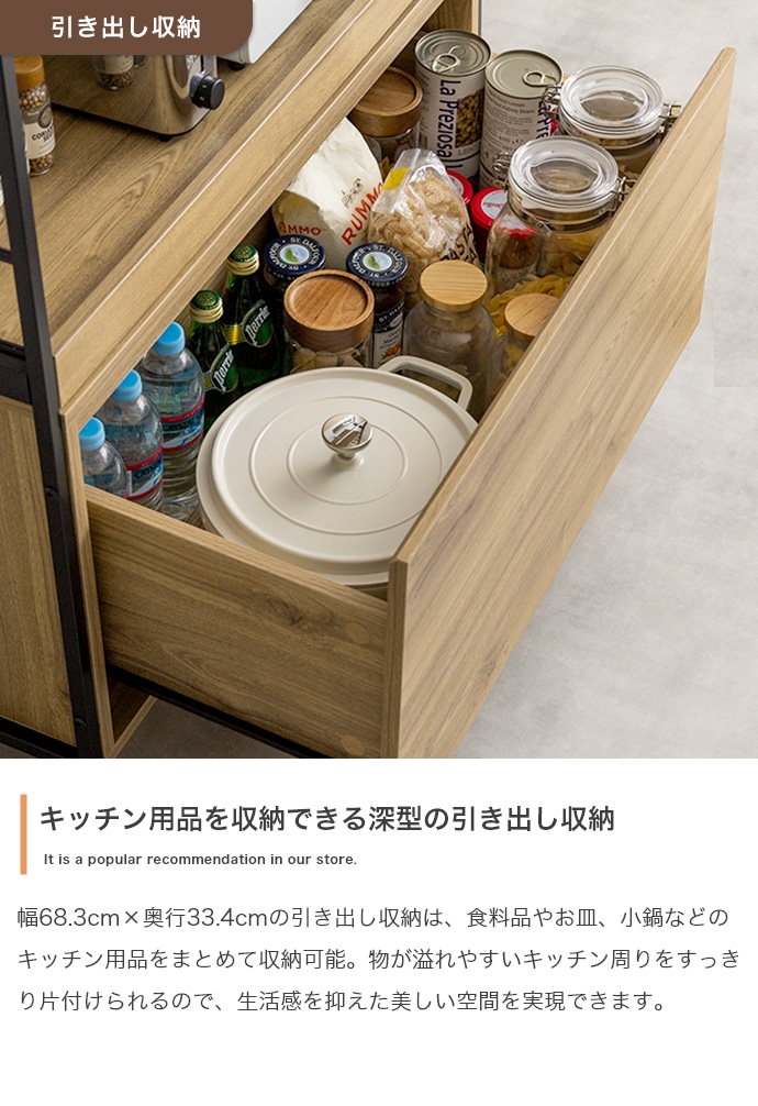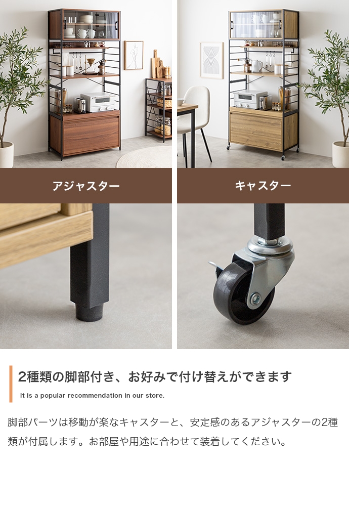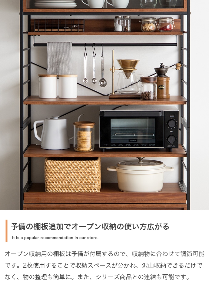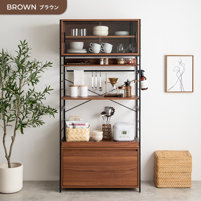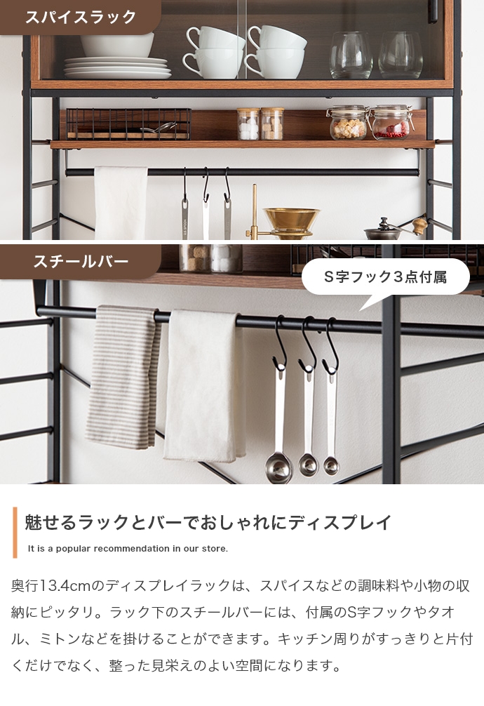 ヴィンテージ感漂う『Carter(カーター)』シリーズの食器棚。美しい木目×スチールの脚が大人の落ち着いた空間を演出します。5種類の収納スペースにより、キッチンに不可欠な家電や雑貨・食器等をまとめて1台に収納可能。オープンスペースの収納が多いので、物の出し入れがしやすく家事を快適に。お気に入りをディスプレイすることで見栄えの良い美しいキッチンが実現できます。