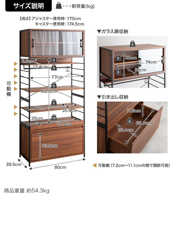 天板:約5kg、ガラス扉収納(可動棚・底板):各約5kg、スパイスラック:約5kg、スチールバー:約5kg、オープン収納(可動棚):約5kg、スライドトレー:約10kg、引き出し収納:約8kg