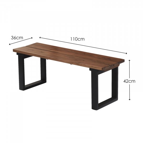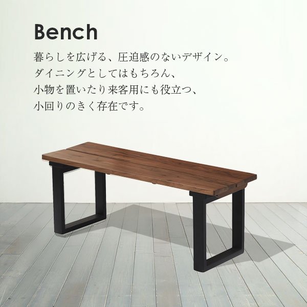ウォールナット無垢材とブラック色の脚の組み合わせがモダンなダイニングベンチ。