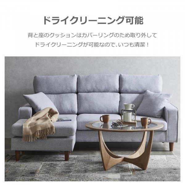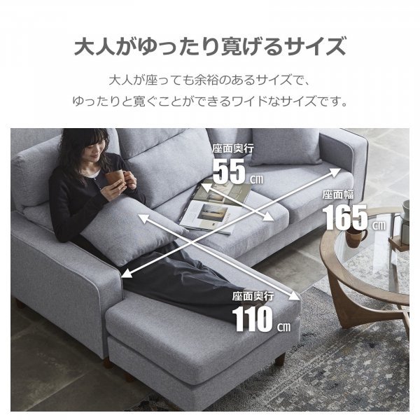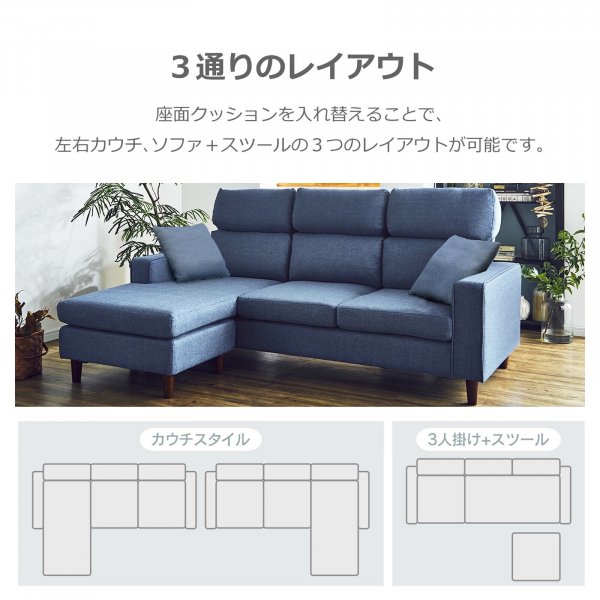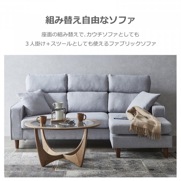 組み替え自由なカウチソファ、座面の組み替えで左右のカウチソファとしても、3人掛けソファ+スツールとしてもお使い頂けます。大人が座っても余裕のあるサイズで、ゆったりと寛ぐことが出来ます。