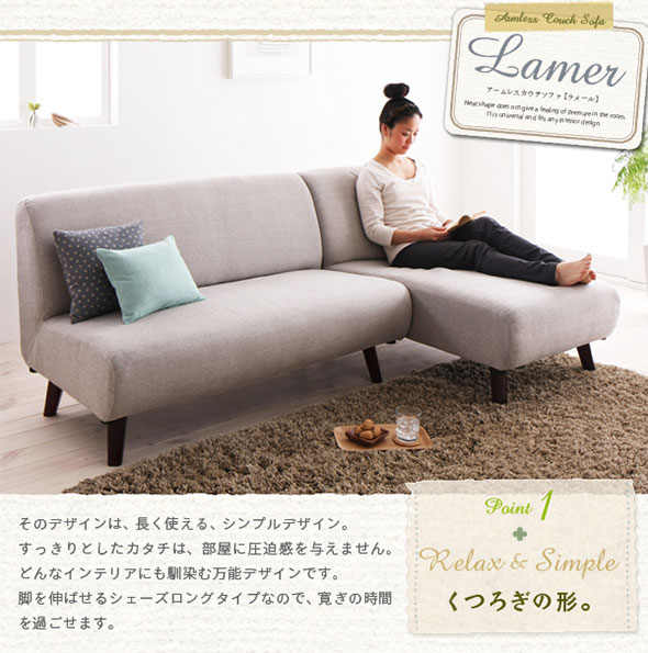すっきりとしたカウチソファは、部屋に圧迫感を与えません。どんなインテリアにも馴染む万能デザインです。脚を伸ばせるシェーズロングタイプなので、寛ぎの時間を過ごせます。