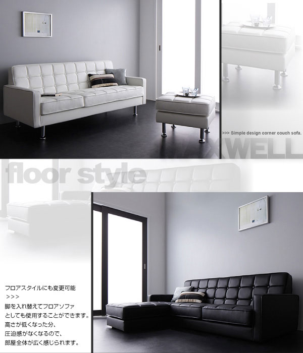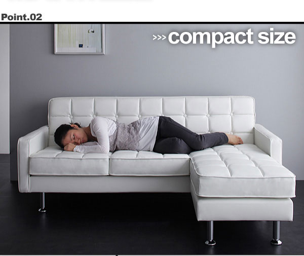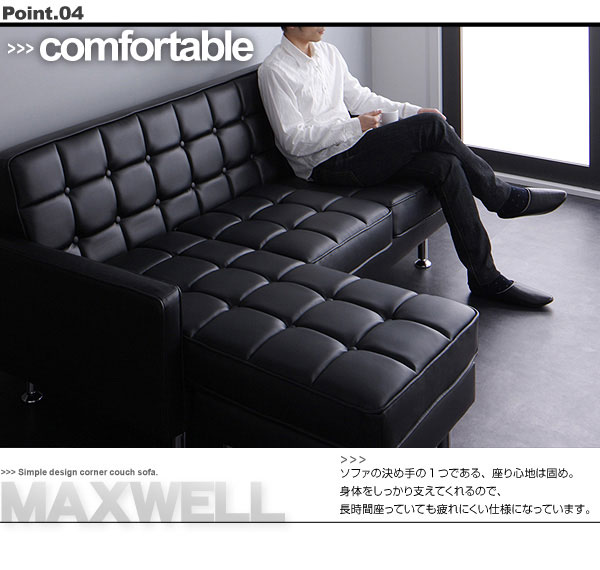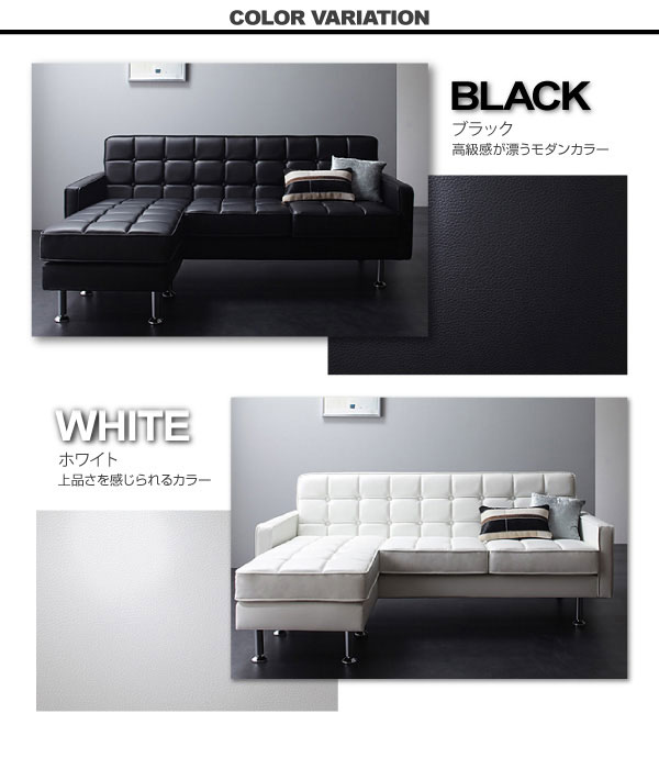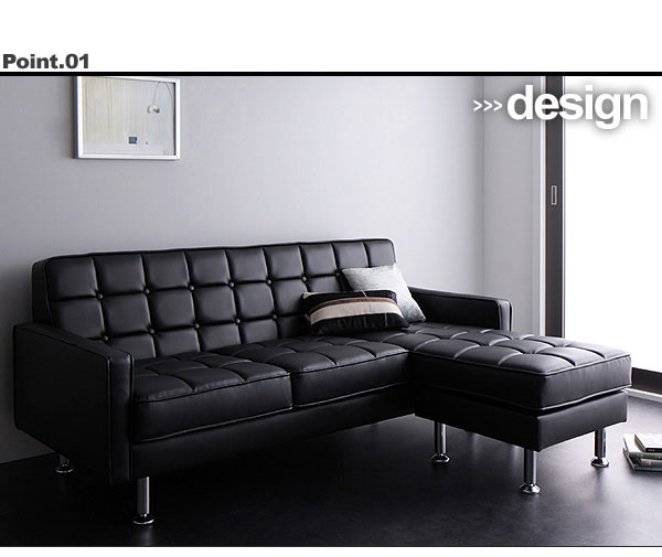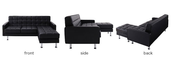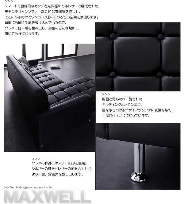 スマートで直線的なカタチと光沢感のあるレザーで構成された、モダンデザインカウチソファ。都会的な雰囲気を漂わせ、そこにあるだけでワンランク上のくつろぎの空間を演出します。背面にも同じ生地を張り込んでいるので、ソファに統一感を生み出し、部屋のどんな場所に置いても様になります。