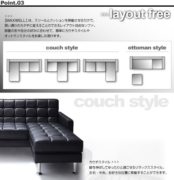 maxwellは、スツールとクッションを移動させるだけで、思い通りのカタチに変えることのできるレイアウト自由なカウチソファ。部屋の形や自分の好みに合わせて、簡単にカウチスタイルやオットマンスタイルをお楽しみ頂けます。