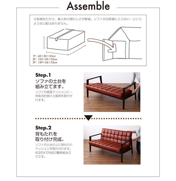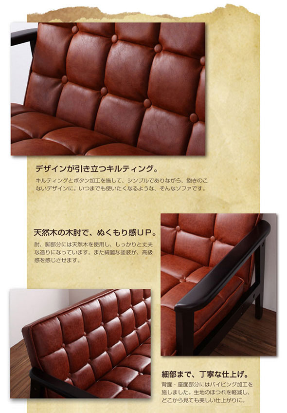 キルティングとボタン加工を施して、シンプルでありながら、飽きのこないデザインに。いつまでも使いたくなるような、そんなソファです。背面・座面部分にはパイピング加工を施しました。生地のほつれを軽減し、どこから見ても美しい仕上がりに。