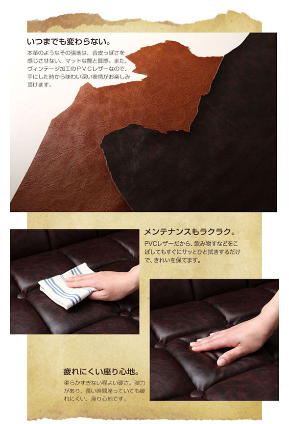 本革のようなその張地は、合皮っぽさを感じさせない、マットな艶と質感。また、ヴィンテージ加工のPVCレザーなので、手にした時から味わい深い表情がお楽しみ頂けます。